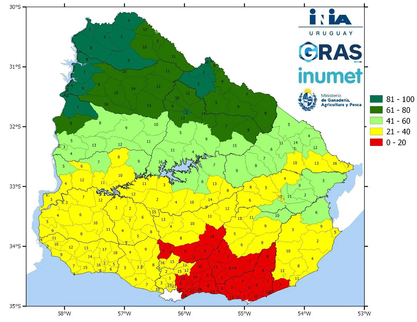 Mapa de água disponível no solo no Uruguai no fim de dezembro | INIA/INUMET