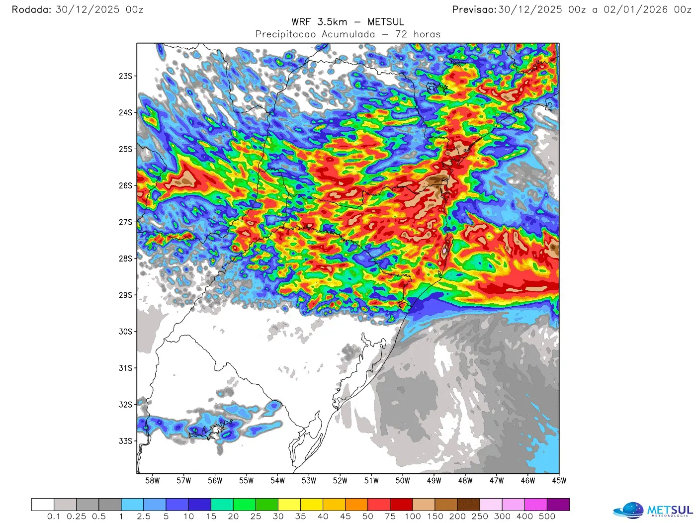 O cenário deve se repetir amanhã (31) e no primeiro dia de 2026 à medida que a massa de ar quente e úmida de origem tropical seguirá formando áreas de instabilidade fortes a intensas localizadas com muita chuva e temporais em diferentes pontos. Destas mesmas regiões sob risco hoje.