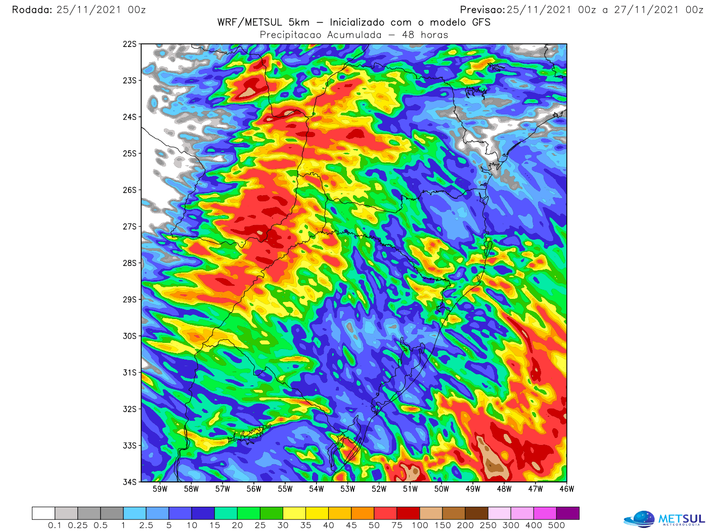 O mapa acima mostra a projeção de chuva até 21h de sexta-feira, conforme a simulação do modelo WRF da MetSul, modelo que está disponível ao assinante na seção de mapas. Como se observa, a perspectiva é de a chuva ser generalizada, mas com enorme variabilidade de volumes de um ponto para outro.