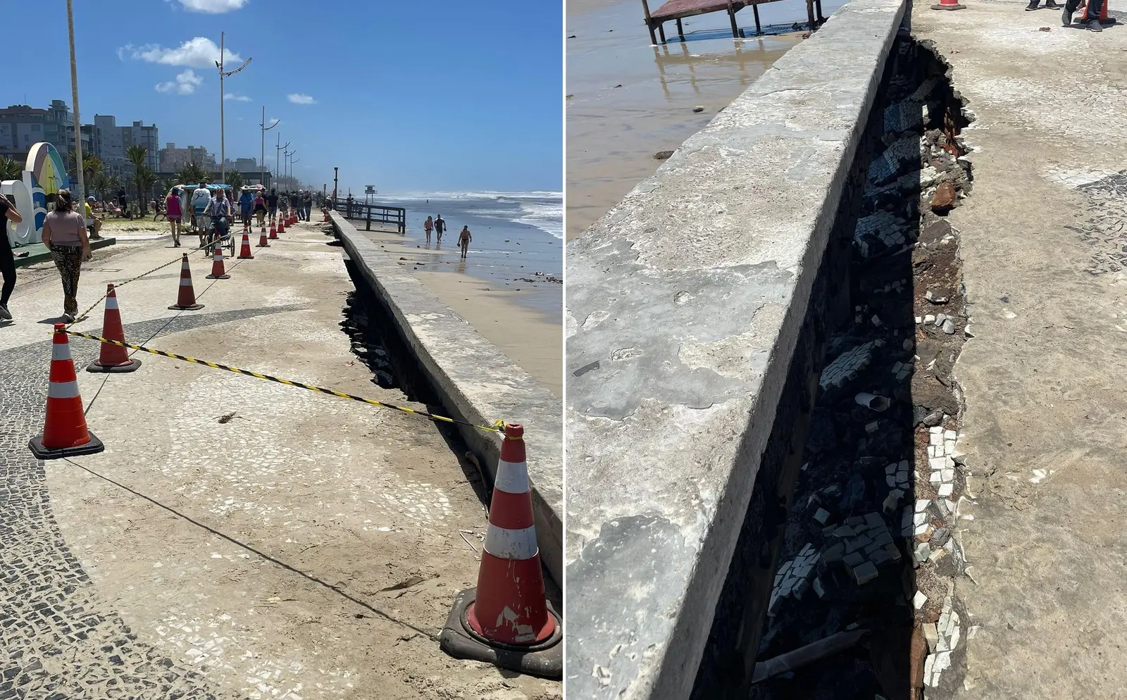 Em Capão da Canoa, a forte ressaca do mar provocou danos ao longo do calçadão da praia, obstruindo a passagem em vários pontos. A orientação da prefeitura ao moradores é evitar o acesso à beira mar, já que os espaços interditados têm risco de desabamento e terão que ser reparados para a temporada de veraneio.