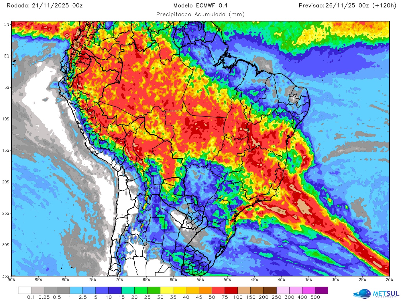 O mapa acima mostra a projeção de chuva para cinco dias do modelo do Centro Meteorológico Europeu (ECMWF), que está disponível ao assinante (assine aqui) em nossa seção de mapas.