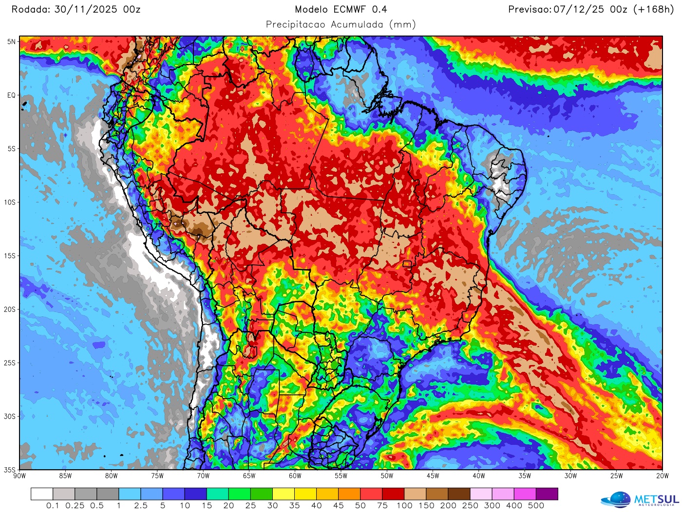 O mapas abaixo do modelo do Centro Meteorológico Europeu (ECMWF) traz a projeção de chuva acumulada nesta semana no Centro-Sul do Brasil em que se constata como os maiores volumes devem ocorrer ao longo do canal de umidade que será organizado pela frente.