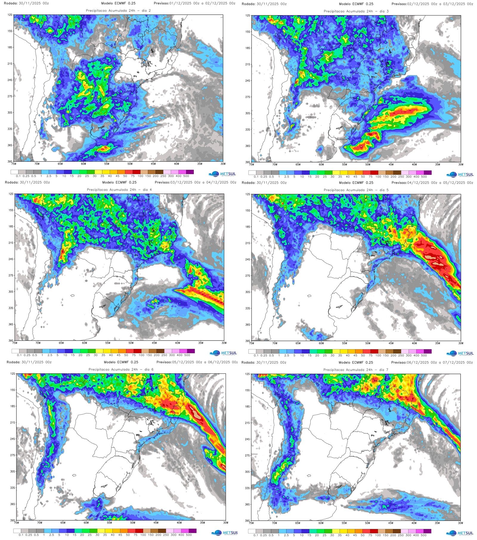 Os mapas a seguir do modelo do Centro Meteorológico Europeu (ECMWF) mostram a tendência de chuva acumulada diária no Centro-Sul do Brasil entre esta segunda-feira (1) e o sábado (6).