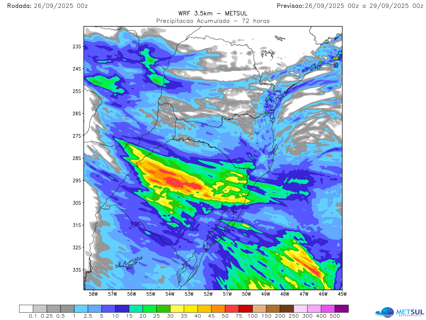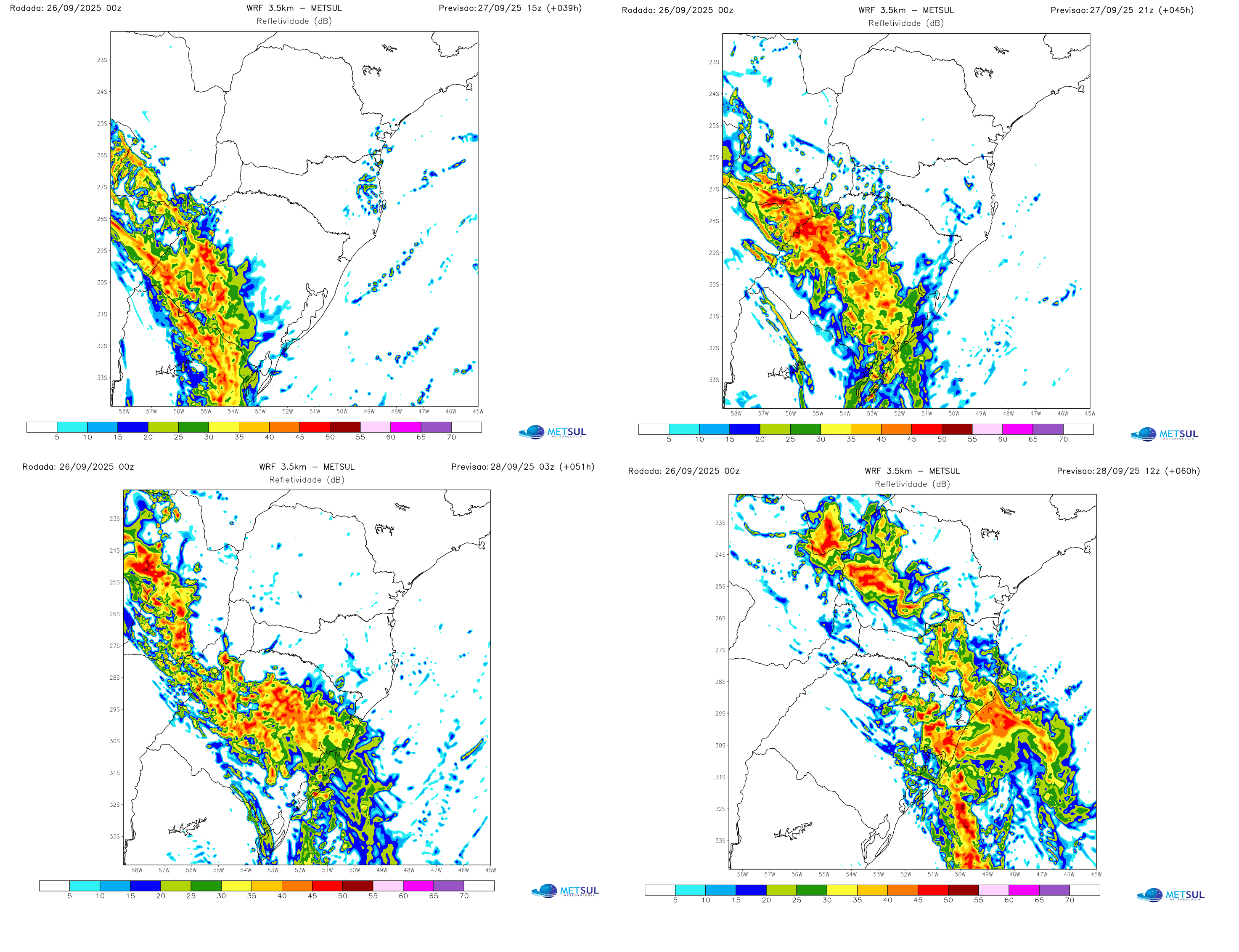 De uma forma geral os modelos projetam grande irregularidade na distribuição da quantidade de precipitação, porém pontualmente poderá chover forte. A projeção do modelo de alta resolução rodado pela MetSul Meteorologia WRF, inicializado pelo americano , indica que alguns pontos poderá chover com volumes expressivos em partes do Norte com previsão de 20 a 50 mm. Em alguns pontos poderá chover entre 50 e 70 mm.