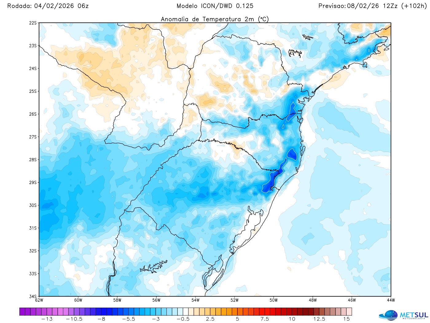 Mapa de anomalia de temperatura do modelo Icon para domingo de manhã mostra temperatura abaixo da média no Sul do Brasil | METSUL