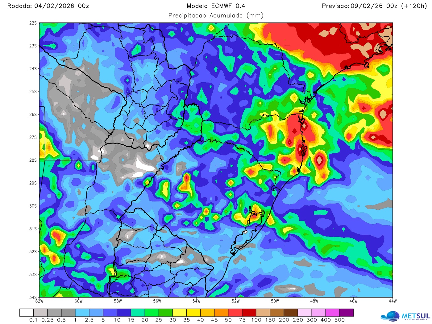 O mapa acima mostra a projeção de chuva para cinco dias do modelo meteorológico do Centro Europeu (ECMWF) em que se observa como os volumes devem ser, em geral, baixos na passagem do sistema pelo território gaúcho. É possível que em alguns locais sequer chova durante a atuação do sistema frontal.