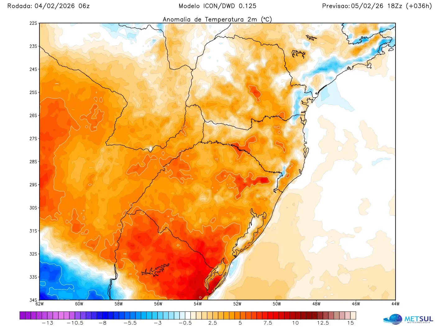 Mapa de anomalia de temperatura do modelo Icon para quinta mostra temperatura acima a muito acima da média no Sul do Brasil | METSUL