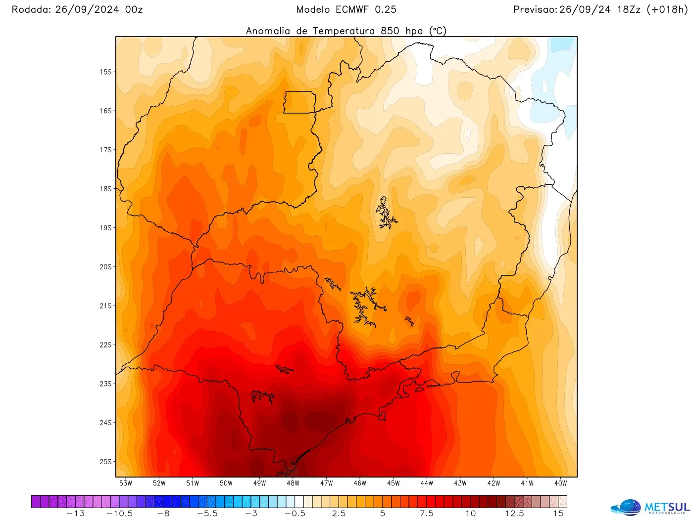 É um valor incrivelmente alto para a área da capital paulista e sinaliza uma massa de ar excepcionalmente quente. Normalmente, nesta época do ano, a temperatura neste nível de altitude na região de São Paulo fica entre 16ºC e 18ºC.