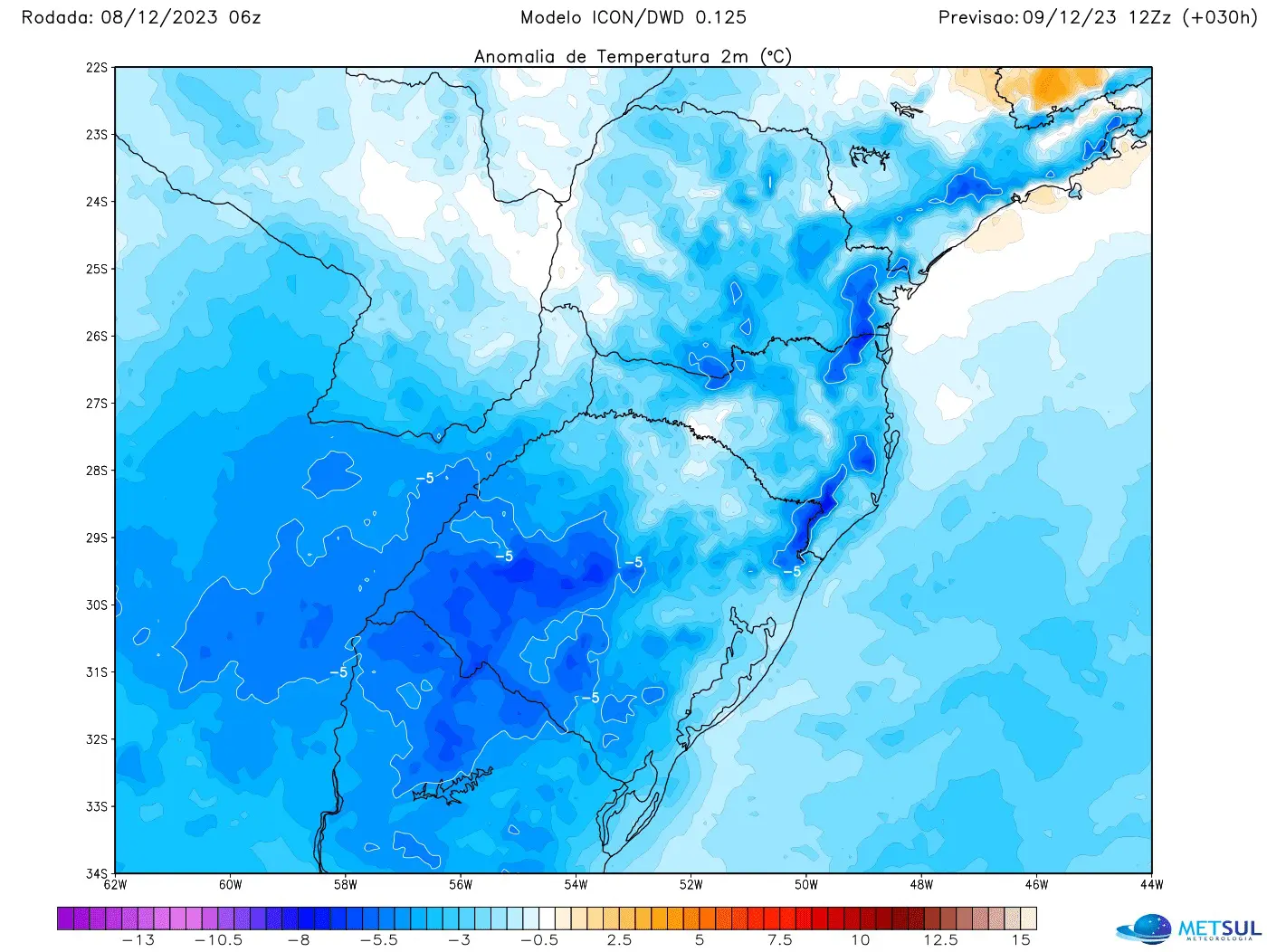 Mínimas ainda mais baixas são esperadas neste sábado. A Campanha e fronteira com o Uruguai deve ter marcas entre 8ºC e 12ºC em vários pontos. Em Porto Alegre, a mínima no Jardim Botânico deve ficar ao redor de 14ºC a 15ºC. A média mínima histórica de dezembro na estação em dezembro é de 19,4ºC. Em alguns pontos do Sul da capital e da Grande Porto Alegre pode fazer até 12ºC ou 13ºC.