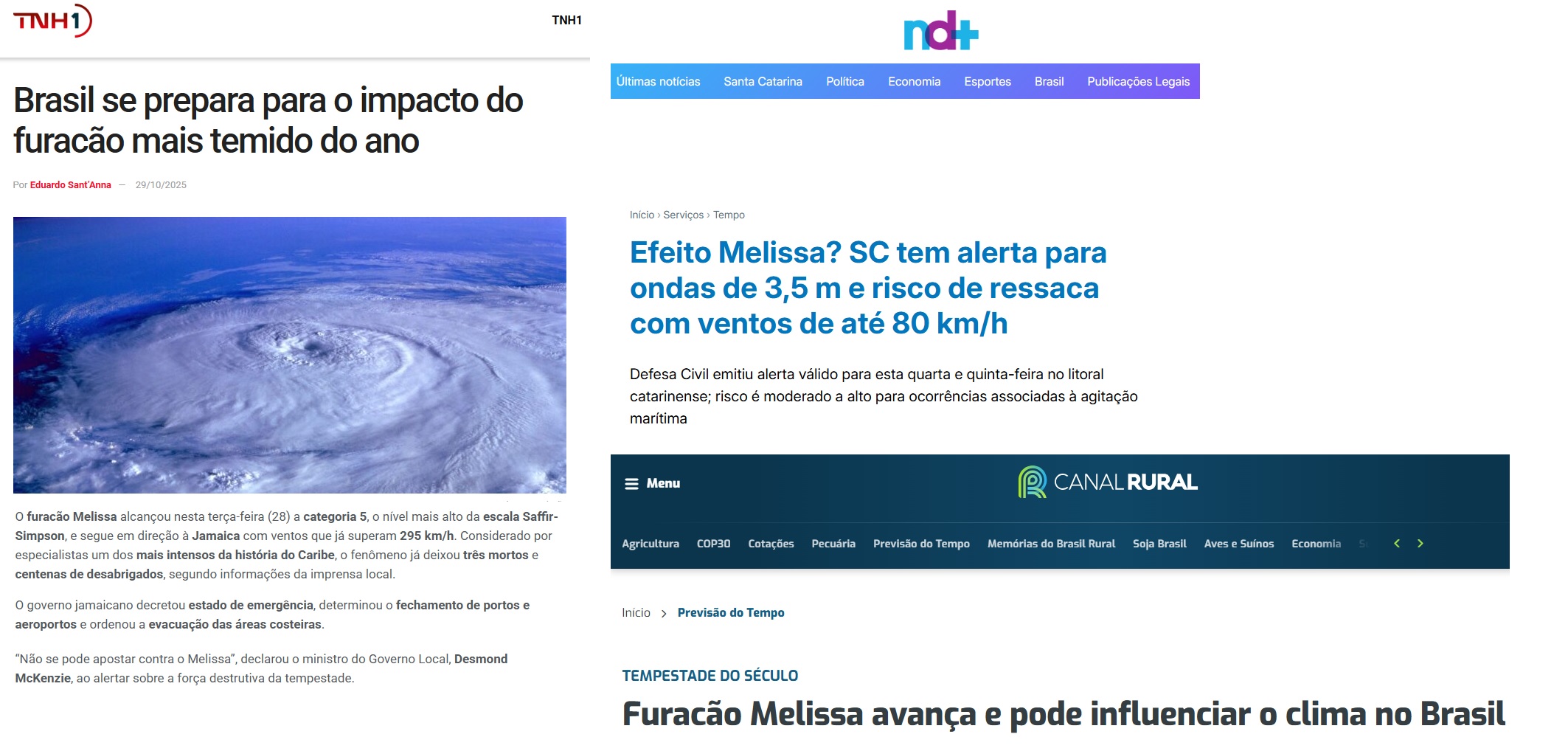 O portal THN1 estampou como manchete: “Brasil se prepara para o impacto do furacão mais temido do ano”. O Canal Rural noticiou em manchete: “Furacão Melissa avança e pode influenciar o clima no Brasil”.