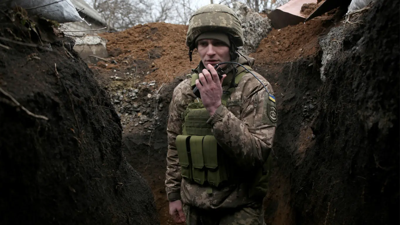 Um militar das forças militares ucranianas fala pelo rádio enquanto mantém posição na linha de frente com os separatistas apoiados pela Rússia, perto de Novolugansk, na região de Donetsk | ANATOLI STEPANOV/AFP/METSUL METEOROLOGIA