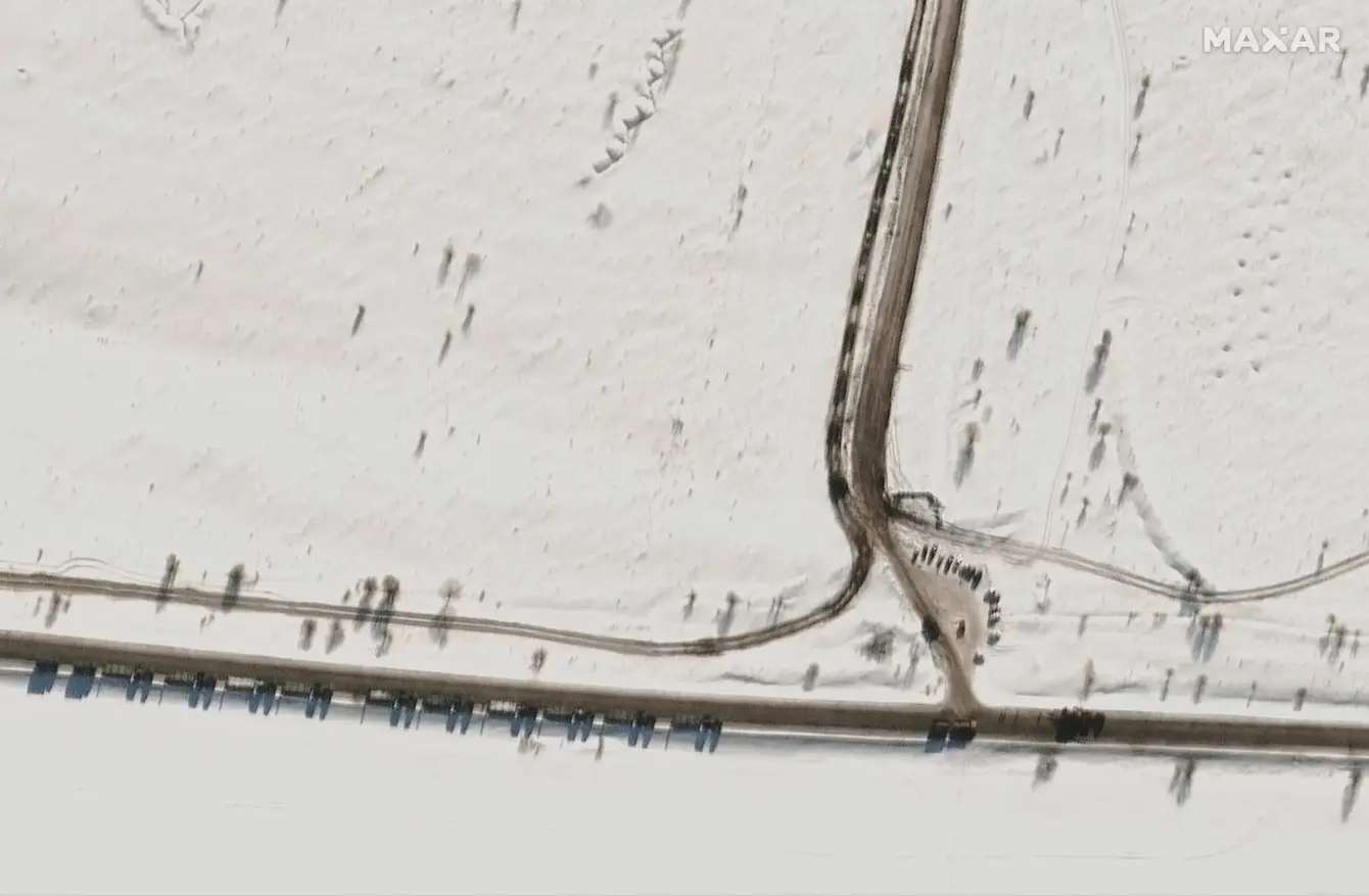 Imagem de satélite de veículos militares chegando a uma área de treinamento perto de Kursk, no Oeste da Rússia, com o solo coberto de neve | MAXAR TECHNOLOGIES