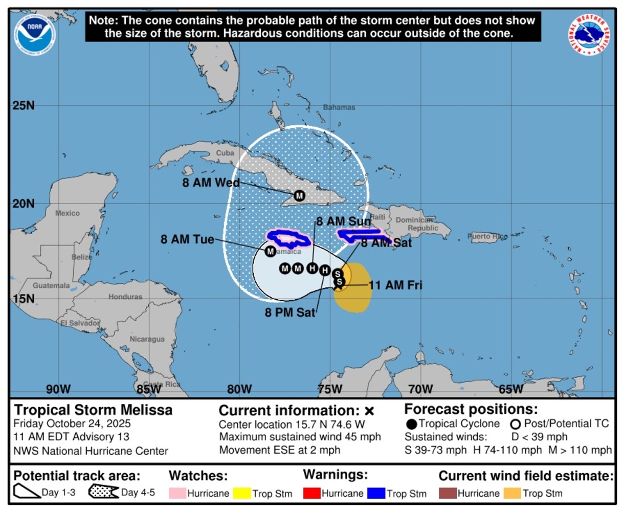 A mais recente atualização do NHC projeta que Melissa passará muito próxima da Jamaica no fim de semana e depois seguirá para o norte, possivelmente atingindo Cuba, as Ilhas Turcas e Caicos e as Bahamas. No entanto, os meteorologistas alertam que uma leve mudança no posicionamento do centro da tempestade pode alterar drasticamente os impactos. Se Melissa fizer uma curva mais ao oeste, Jamaica pode enfrentar ventos de furacão por mais de 48 horas. Se o movimento for mais ao leste, o Haiti e o sul da República Dominicana serão os mais atingidos.