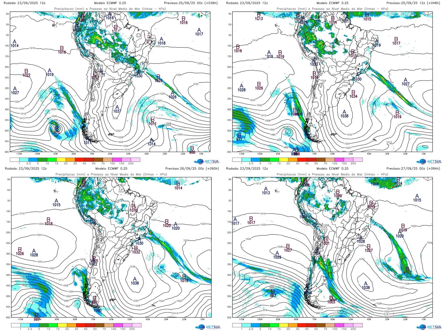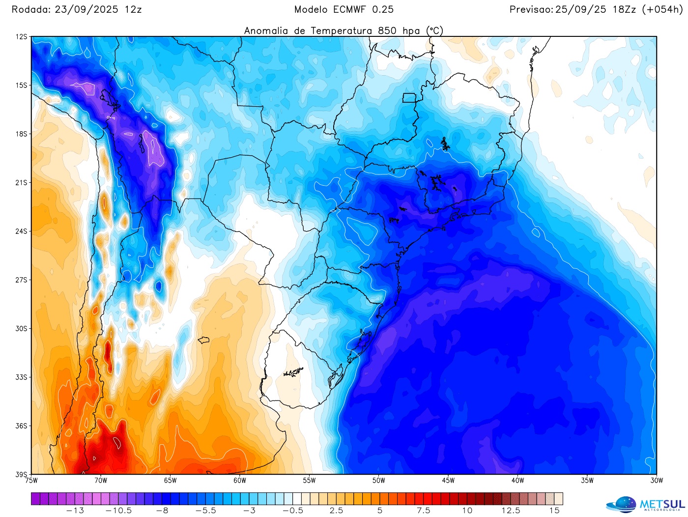Como se observa, a alta pressão estará inicialmente nesta quarta-feira sobre continente, na altura da província argentina de Buenos Aires, devendo avançar para o Atlântico Sul, onde deve se intensificar com sua crista afetando o Sul e o Sudeste do Brasil.