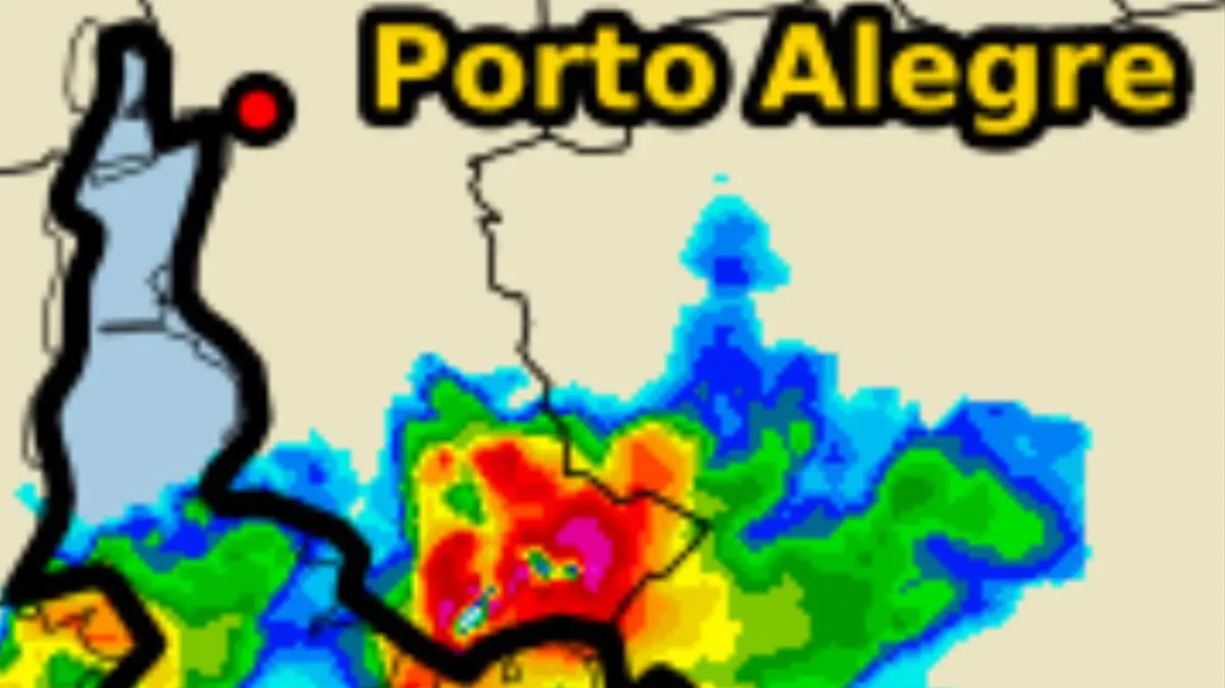 A imagem do radar meteorológico de Porto Alegre das 14h40 desta terça-feira mostra a célula de temporal que atingiu com granizo o sul da cidade no momento em que quase toda a capital gaúcha tinha sol e parcial nebulosidade sem qualquer indício de chuva.