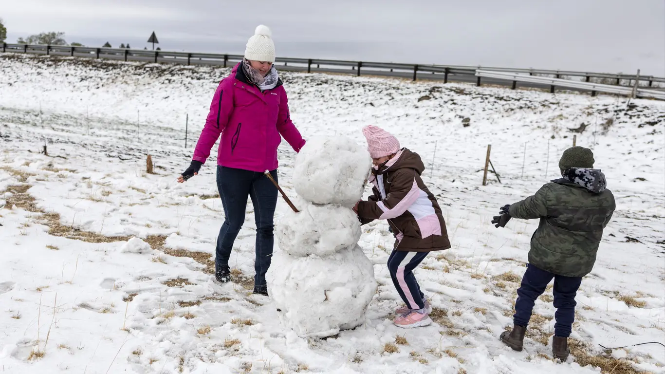 Nathalie, Haylie e Lewellyn Smith fazem um boneco de neve em um campo esportivo coberto de neve em Warden, província de Free State, África do Sul, neste sábado. Uma queda de neve excepcionalmente forte causou grandes interrupções nas estradas da África do Sul. A principal rodovia N3 que liga Joanesburgo à cidade de Durban, na costa Leste, foi uma das mais afetadas e várias partes foram bloqueadas. | WIKUS DE WET/AFP/METSUL METEOROLOGIA