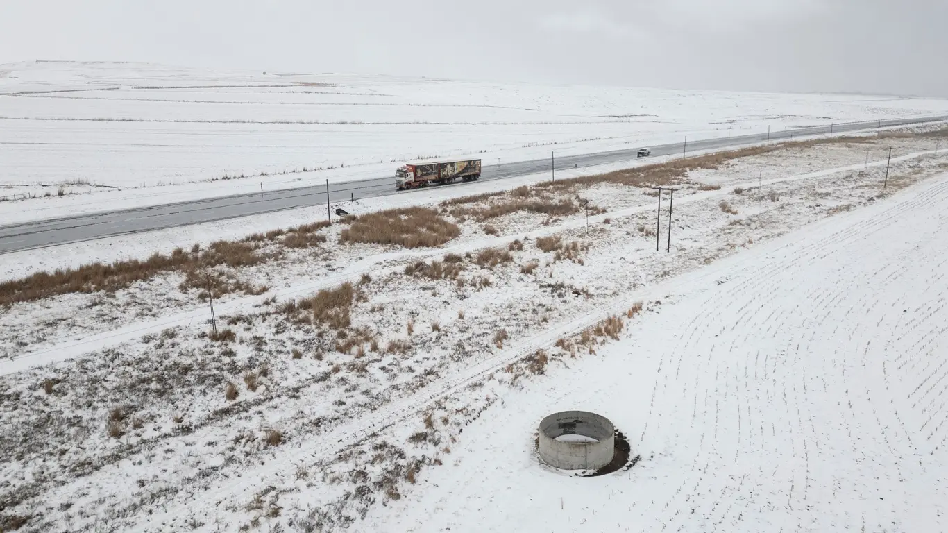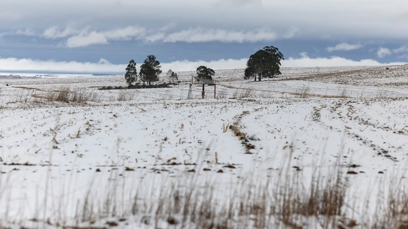 Paisagem coberta de neve neste sábado em estrada que cruza terras agrícolas perto de Warden, província de Free State, na África do Sul. | WIKUS DE WET/AFP/METSUL METEOROLOGIA