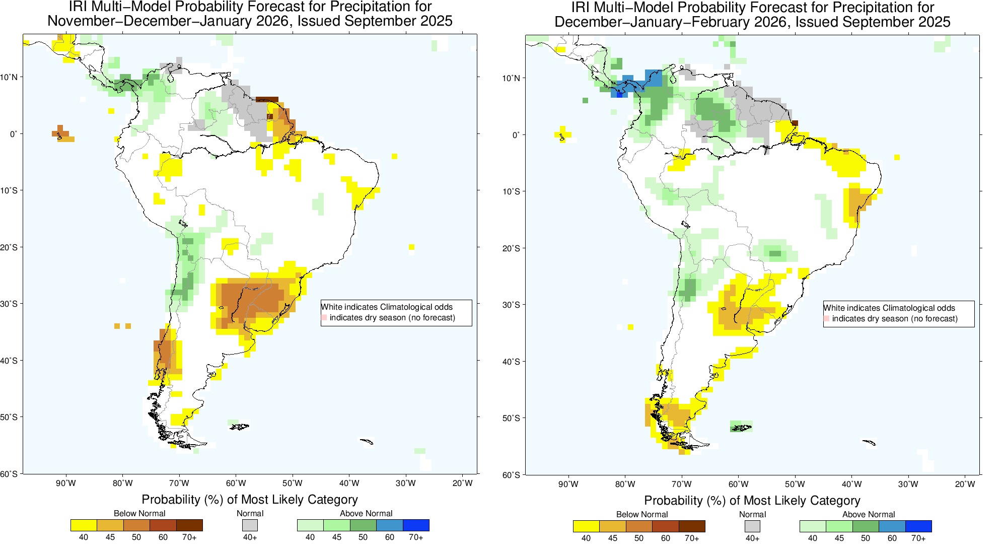 Os mapas acima mostram a projeção multi-modelo da Universidade de Columbia de probabilidade de anomalia de precipitação para os trimestres de novembro a janeiro e de dezembro a fevereiro, compreendendo grande parte da safra de verão 2025-2026.
