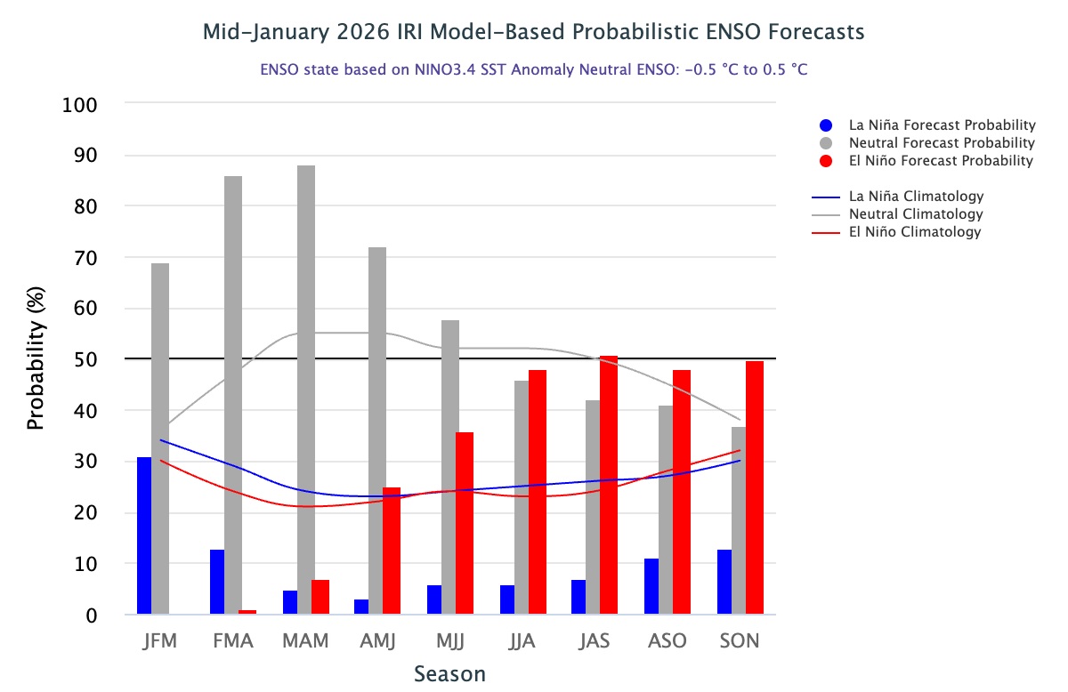 No trimestre de junho a agosto, o de inverno, 6% de probabilidade de La Niña, 46% de neutralidade e 48% de El Niño. No trimestre de julho a setembro, importante para a safra de inverno e o trigo, 7% de probabilidade de La Niña, 42% de neutralidade e 51% de El Niño. Já no trimestre de agosto a outubro, que cobre já dois terços da primavera climática, 11% de La Niña, 41% de neutralidade e 48% de probabilidade de El Niño. Por fim, no trimestre de setembro a novembro, o da primavera na climatologia, 13% de La Niña, 37% de neutro e 50% de El Niño.