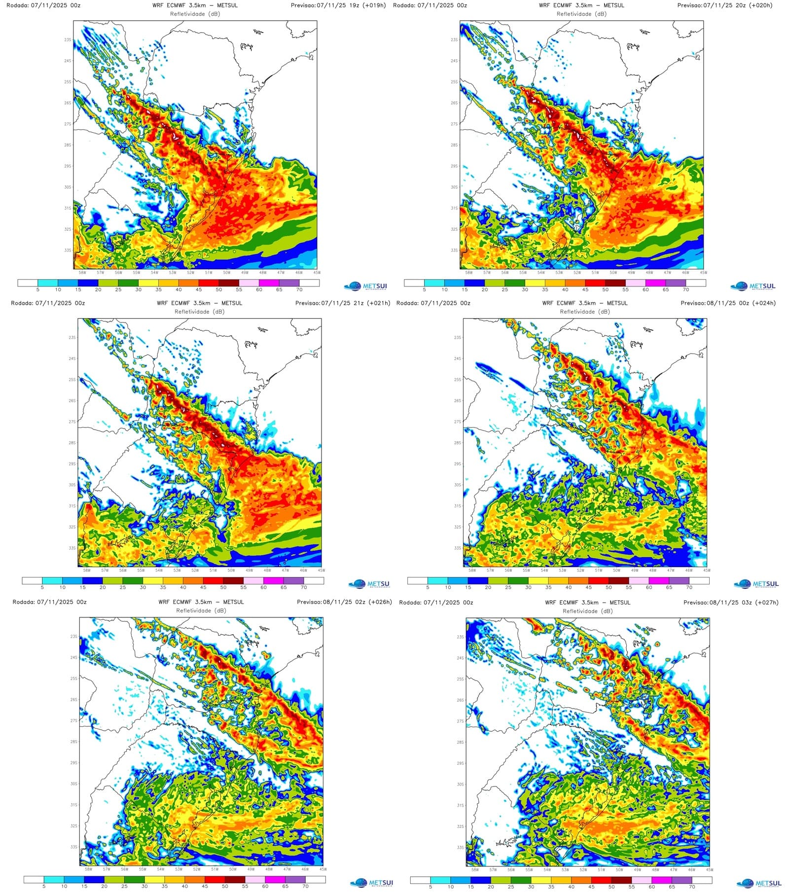Este é um risco elevado no deslocamento desta linha de instabilidade pelo Sul do país até São Paulo. Como os mapas a seguir do modelo WRF-ECMWF mostram, a linha deve ser intensa e com múltiplas células de tempestade, o que eleva o risco de vendavais com vento horizontal linear intenso.