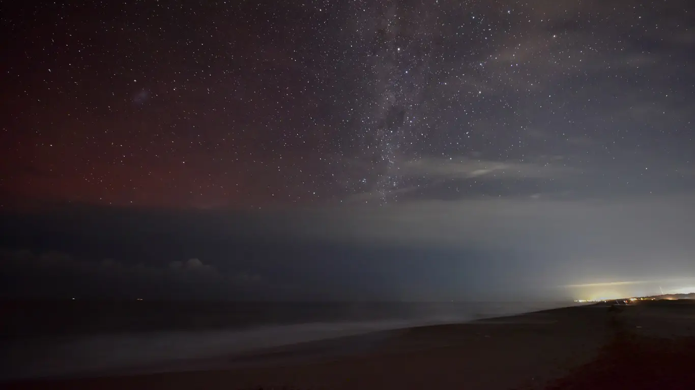 Aurora Austral é vista fracamente sobre o Atlântico, à esquerda da Via Láctea, na praia de Santa Mônica, perto de José Ignacio, departamento de Maldonado, Uruguai, na noite de ontem. Ao fundo, as luzes de Punta del Este brilhando à direita. | MARIANA SUAREZ/AFP/METSUL METEOROLOGIA