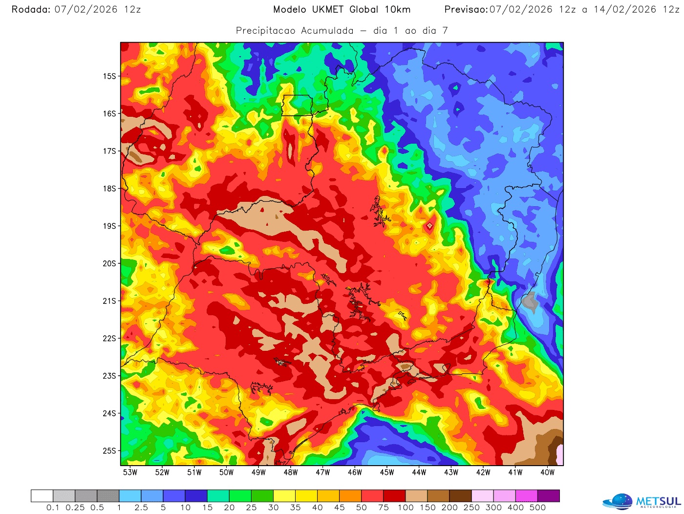 O mapa acima mostra a projeção de chuva para a semana do modelo meteorológico UKMET do Met Office, do Reino Unido, que pode ser consultado a qualquer hora pelo nosso assinante na seção de mapas (clique aqui para ter acesso).