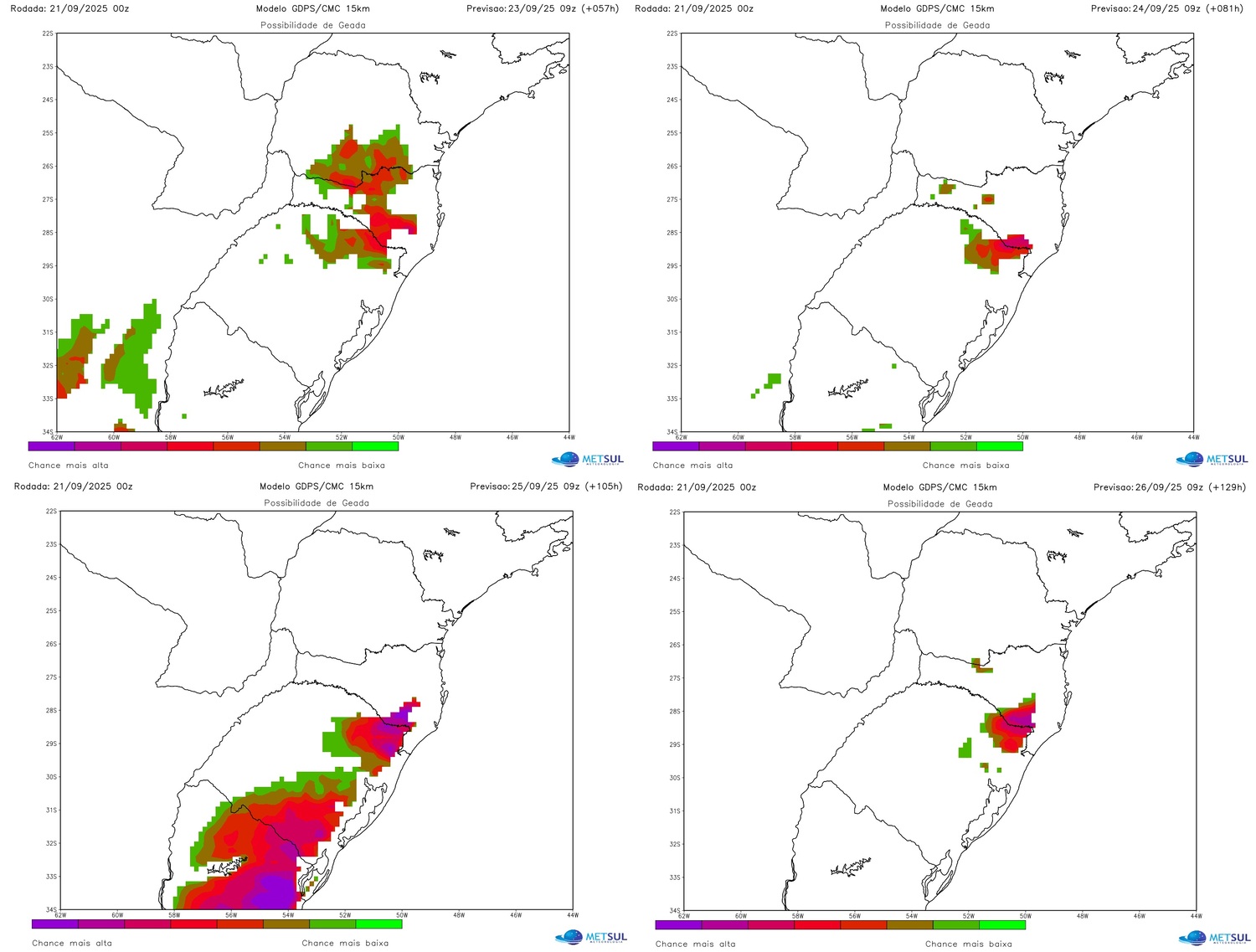 Como se observa nos mapas, na sexta a geada deve se concentrar mais no Planalto de Palmas do Paraná, no Planalto Sul Catarinense, entre o Planalto Médio e a Serra e os Aparados do Rio Grande do Sul, e ainda em áreas perto do Uruguai na Campanha gaúcha.