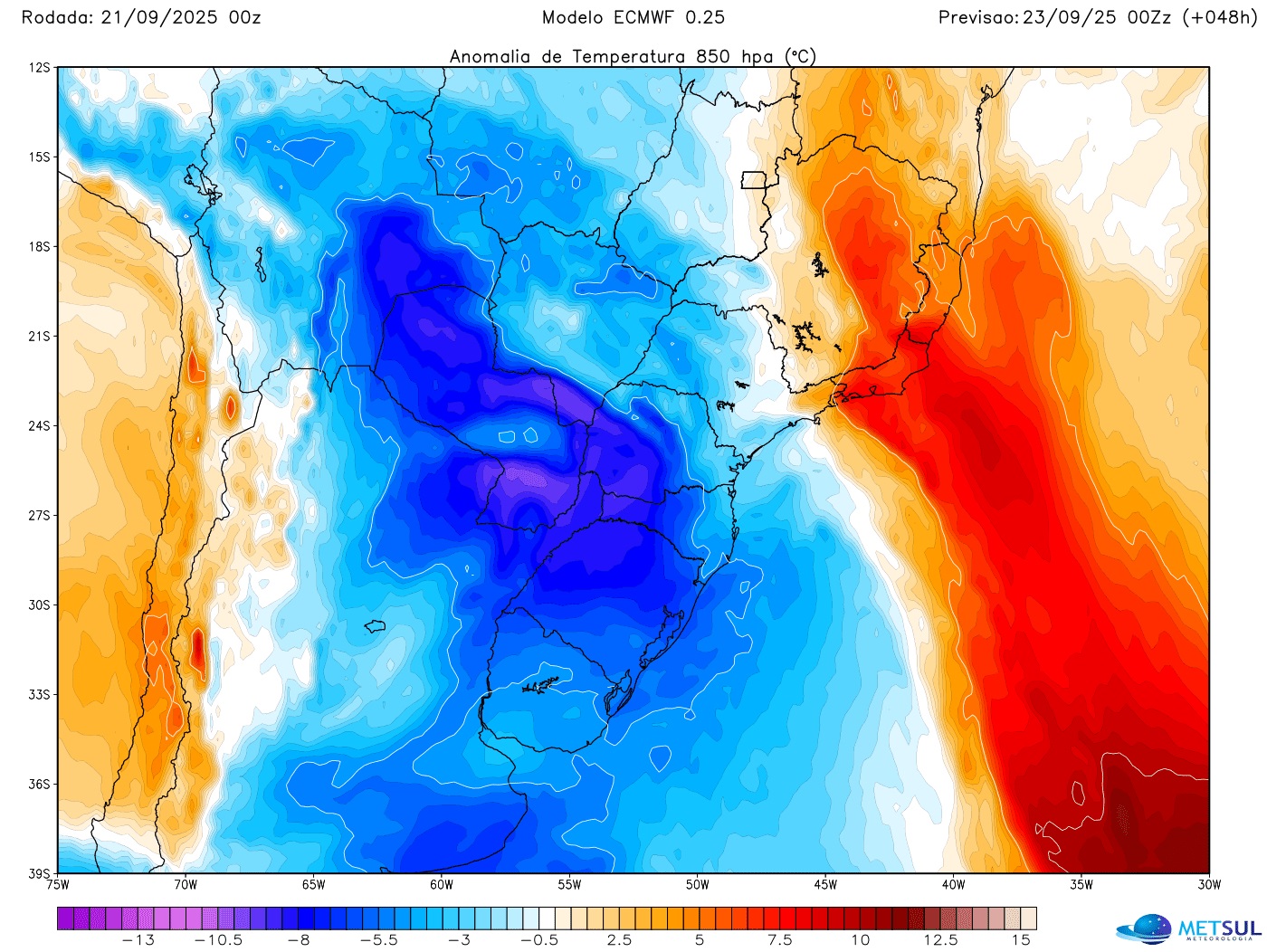 A massa de ar frio também afetará o Sudeste do Brasil com queda maior da temperatura em São Paulo e no Rio de Janeiro. O ar frio sobre o Oceano Atlântico vai se reforçar na segunda metade desta semana, proporcionando vários dias seguidos de mínimas baixas e tardes de temperatura abaixo do normal para o fim de setembro.