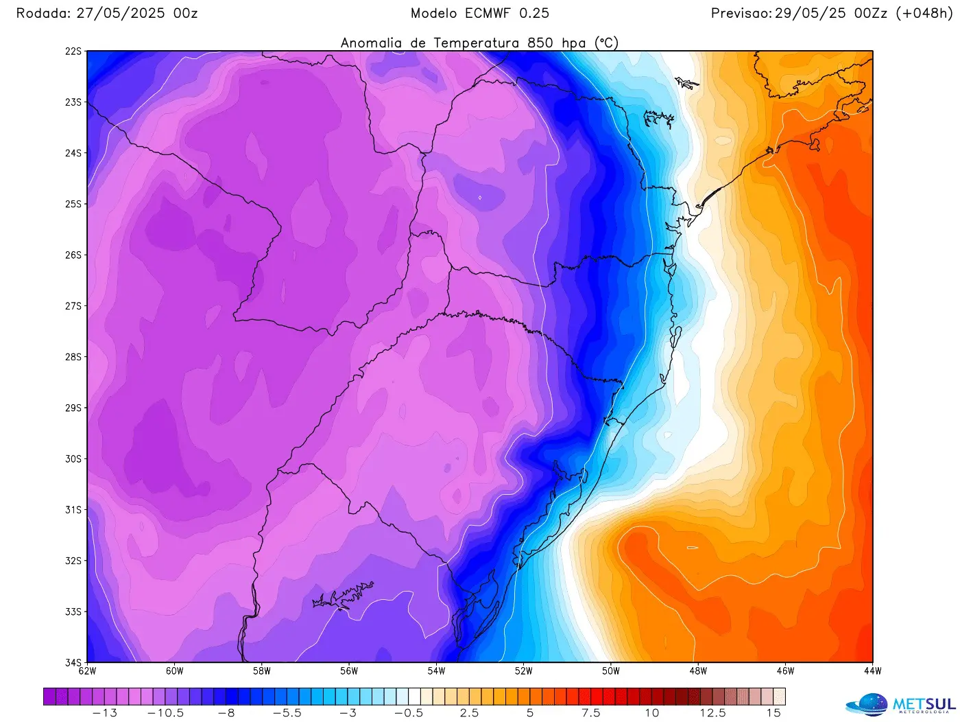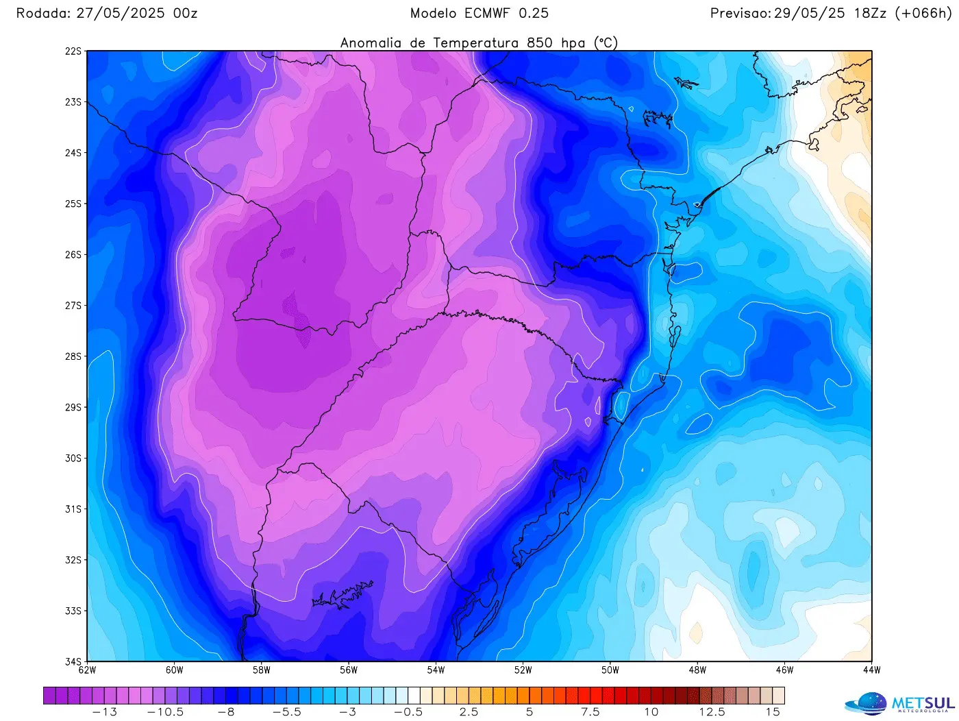 Mapa de anomalia de temperatura em 850 hPa (1500 metros) do modelo europeu mostra ar gelado no Sul do Brasil na tarde de quinta | METSUL