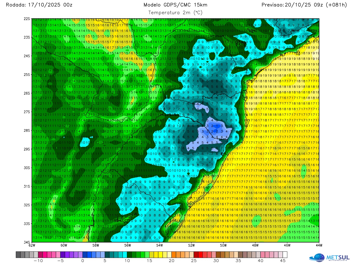 Na cidade de São Paulo, o ar frio começa a ingressar acompanhado de chuva domingo, que terá uma tarde com cara de inverno com temperaturas de 13ºC a 15ºC em pleno 19 de outubro. As madrugadas de segunda, terça e quarta na capital paulista terão marcas ao redor dos 10ºC, mas em alguns pontos da cidade deve fazer até menos com chance de mínimas de 8ºC ou 9ºC.
