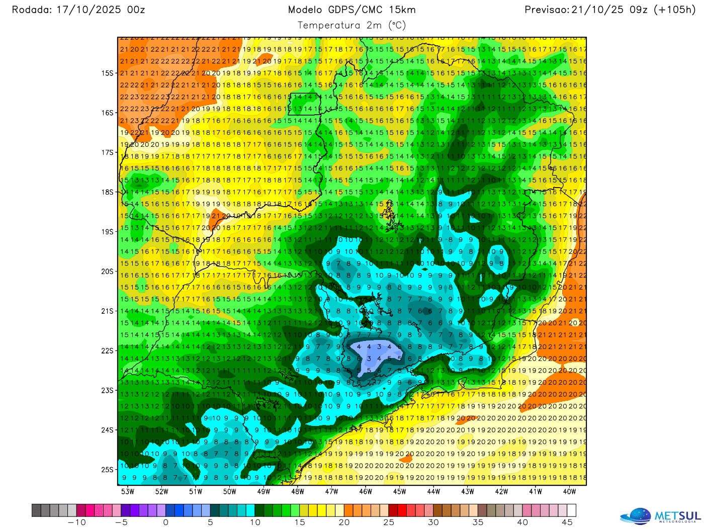 A temperatura declinará com a massa de ar frio também em quase todo o Sudeste do Brasil e com possibilidade de marcas invernais em cidades serranas na Mantiqueira entre São Paulo, Minas Gerais e o Rio de Janeiro. Praticamente todas as madrugadas da semana que vem serão frias no Sul de Minas Gerais e várias terão marcas inferiores a 5ºC.