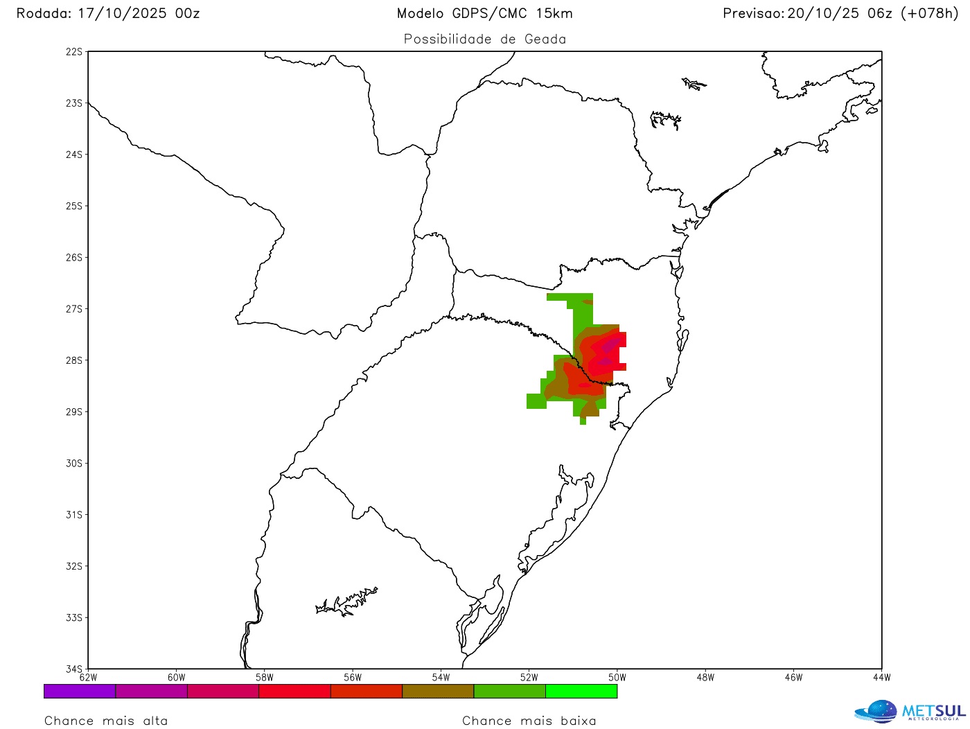 Com a chegada desta nova incursão de ar frio, os três estados do Sul do Brasil voltarão a ter geada, mas que não será forte nem generalizada, concentrando-se mais em baixadas das regiões de maior altitude dos três estados.