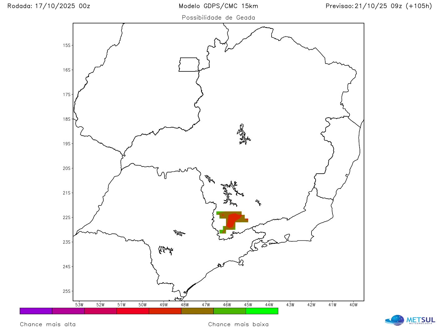 No Sudeste, várias madrugadas seguidas podem ter geada na próxima semana no Sul de Minas Gerais, em baixadas e fundos de vales de localidades como Maria da Fé e Delfim Moreira. Mesmo em baixadas da paulista Campos do Jordão não se afasta o fenômeno.