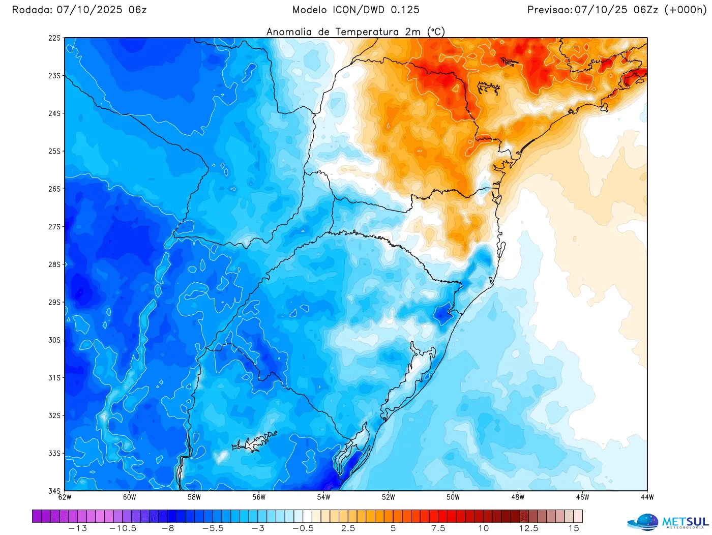 Anomalia de temperatura (desvio da média) na madrugada de hoje | METSUL