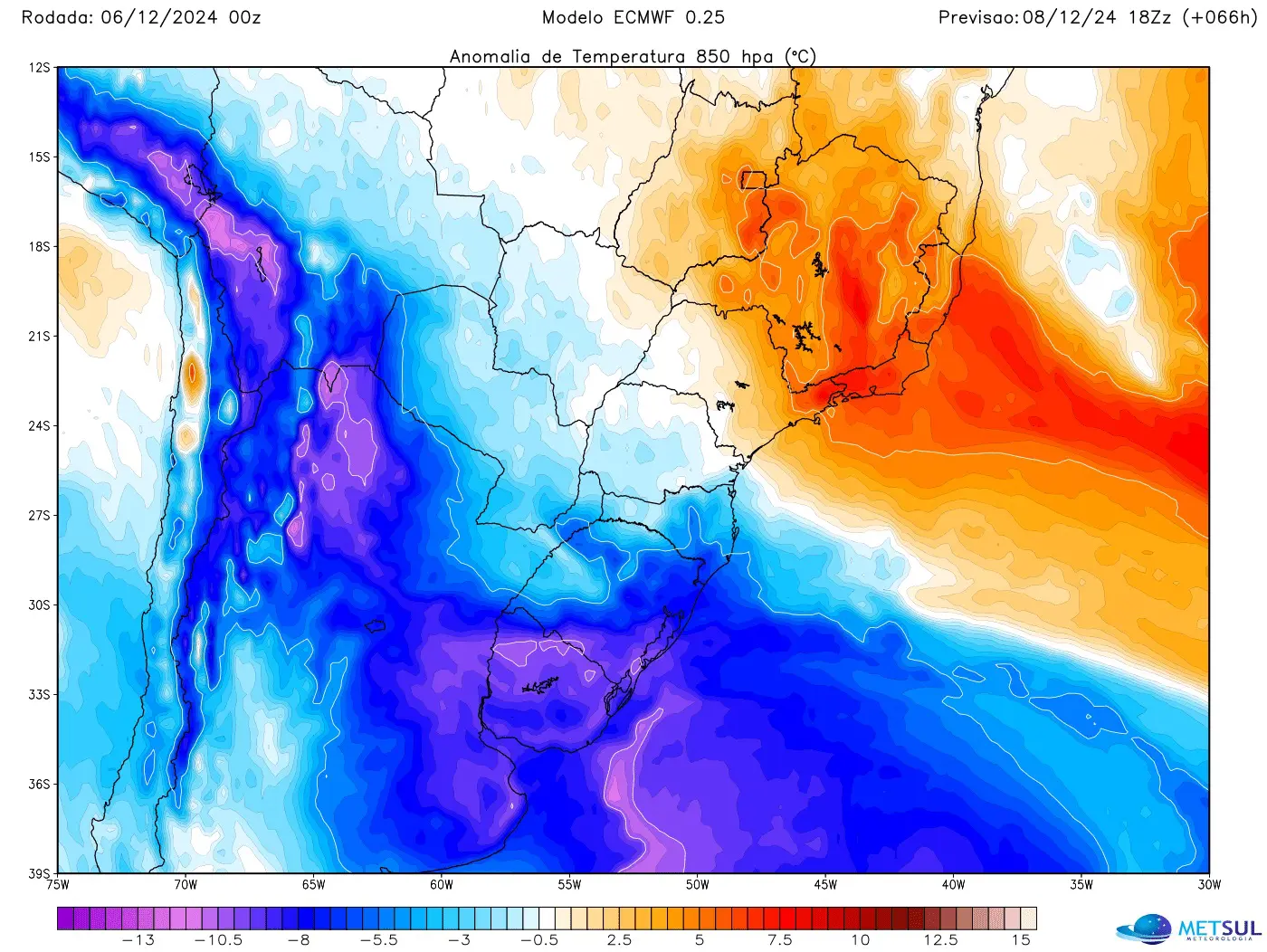 A MetSul Meteorologia projeta que a massa de ar frio vai atingir o Sul do Brasil neste fim de semana e no começo da semana que vem com queda acentuada da temperatura e um grande refresco depois desta sexta-feira que é de forte a intenso calo em muitas cidades da Região Sul.