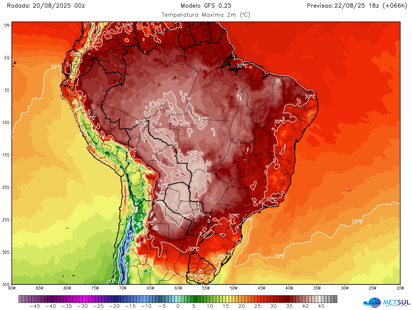 O episódio quente será responsável por temperaturas perto e acima de 40ºC em vários estados nos próximos dias com calorão de Norte a Sul do Brasil. Será um evento de calor significativo para o mês de agosto com temperatura elevada em uma extensa área do território brasileiro e marcas muito acima da média climatológica desta época do ano em diversas regiões do país.