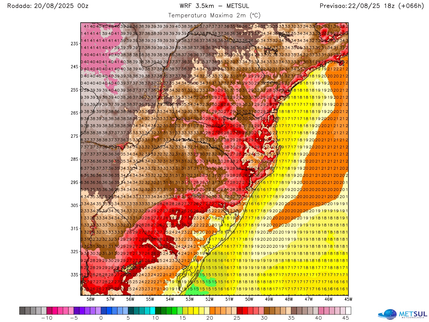 Máximas previstas pelo modelo WRF para a tarde de sexta no Sul do Brasil | METSUL