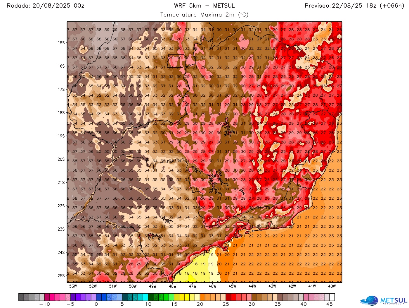 Máximas previstas pelo modelo WRF para a tarde de sexta no Sudeste do Brasil | METSUL