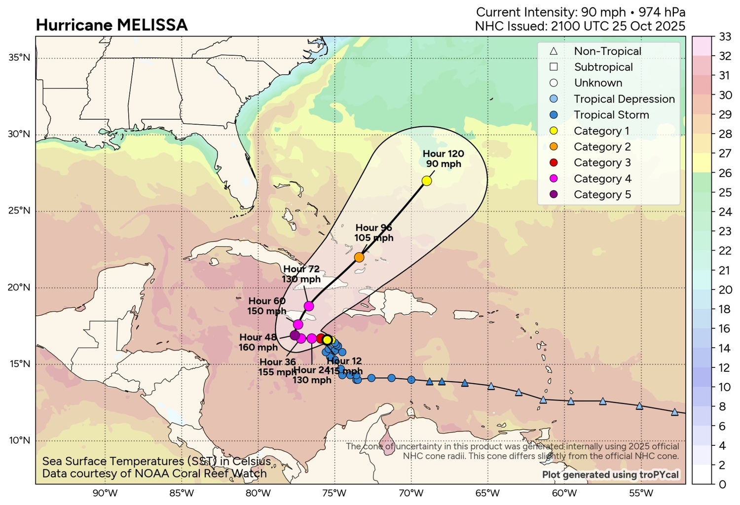 Agora, há potencial para intensificação ainda maior e Melissa pode atingir neste começo de semana a categoria 5, o máximo da escala Saffir-Simpson de furacões no Atlântico, com ventos sustentado acima de 250 km/h e rajadas ao redor dos 300 km/h, se não superiores.