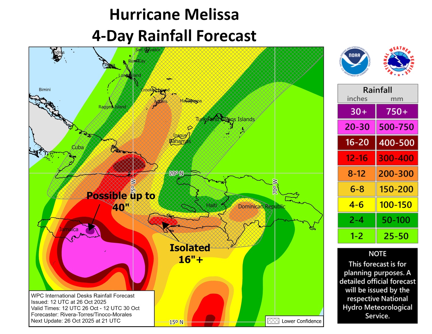 Mesmo antes da chegada do olho do furacão, já se espera tempo extremo com ventos e precipitações intensas neste domingo e segunda-feira. Após cruzar a ilha jamaicana, o furacão deve seguir em direção a Cuba, Bahamas e Turks e Caicos, onde há risco crescente de chuvas intensas, ventos destrutivos e elevação perigosa do nível do mar. A previsão é de que o impacto total de Melissa seja prolongado, severo e de proporções históricas para a região.
