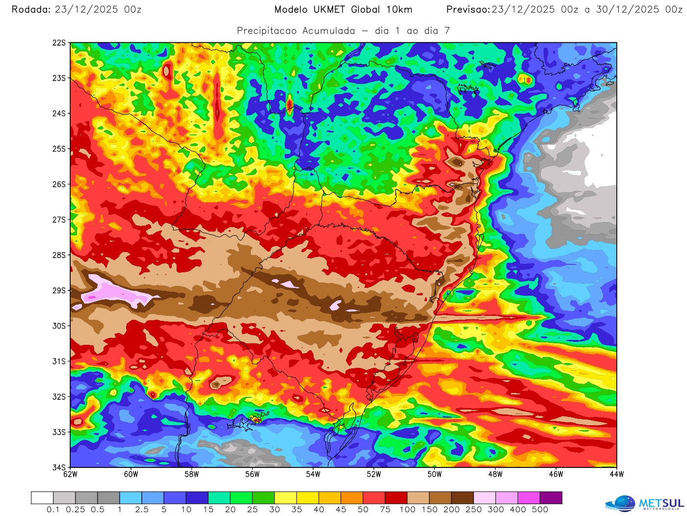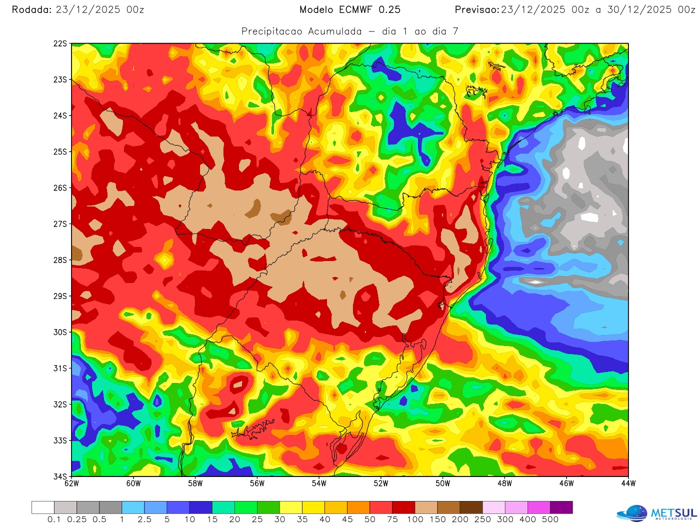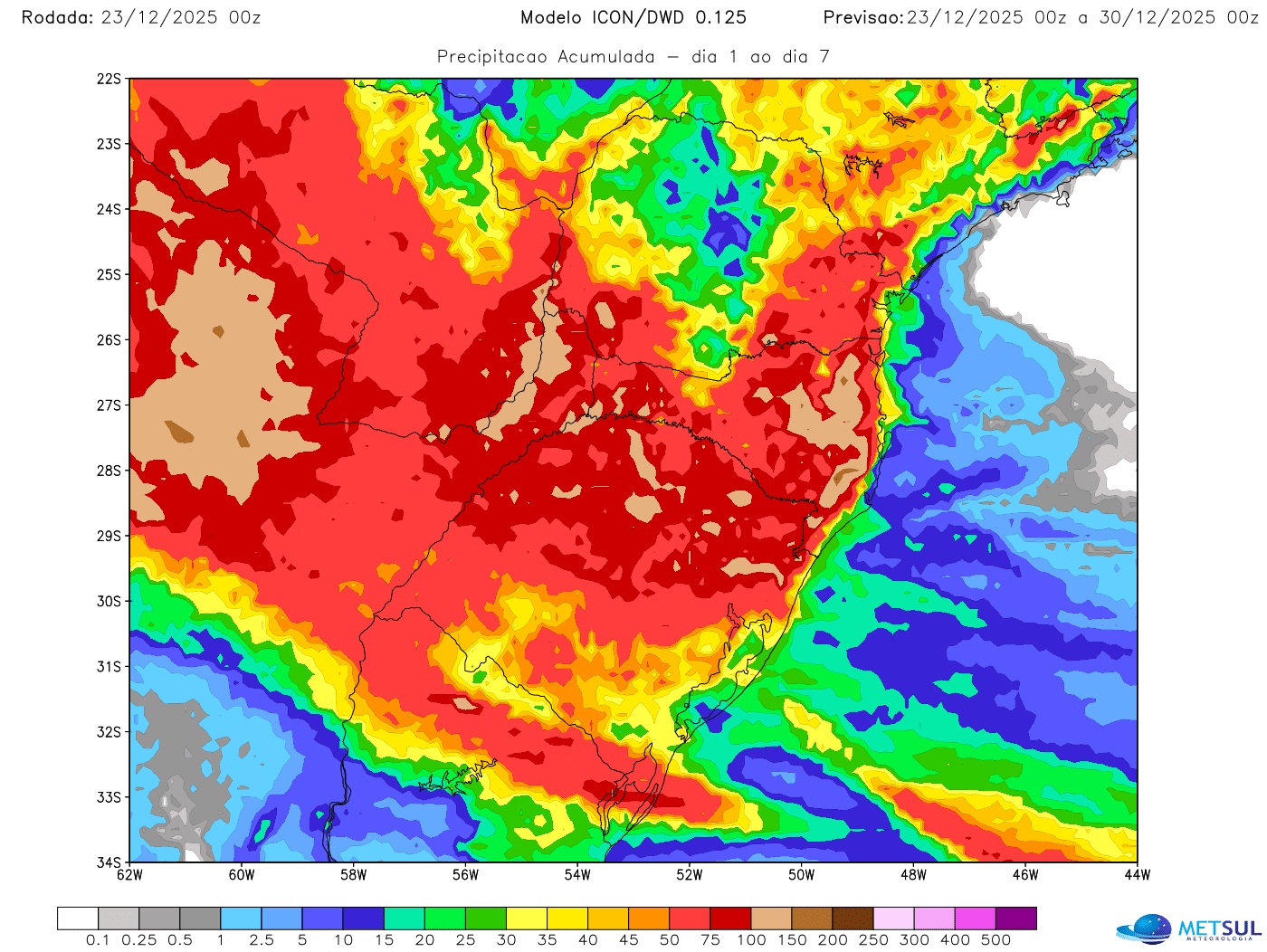 Atente que os modelos estão indicando ainda 100 mm a 200 mm em parte do estado até o começo da semana que vem, especialmente sobre a Metade Norte gaúcha que é a área do território gaúcho que mais choveu até o momento. Não descartamos que, isoladamente, possa chover até mais. Note também que uma das regiões que pode ter chuva com volumes altos é a região de Porto Alegre e sua área metropolitana, onde até o momento os volumes não foram altos.