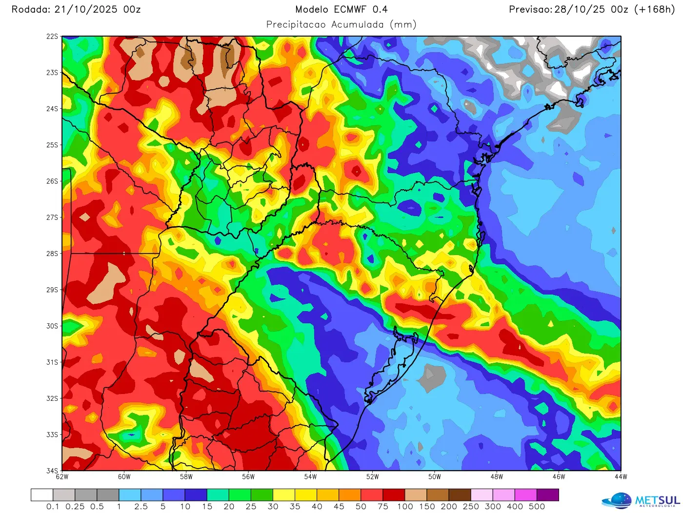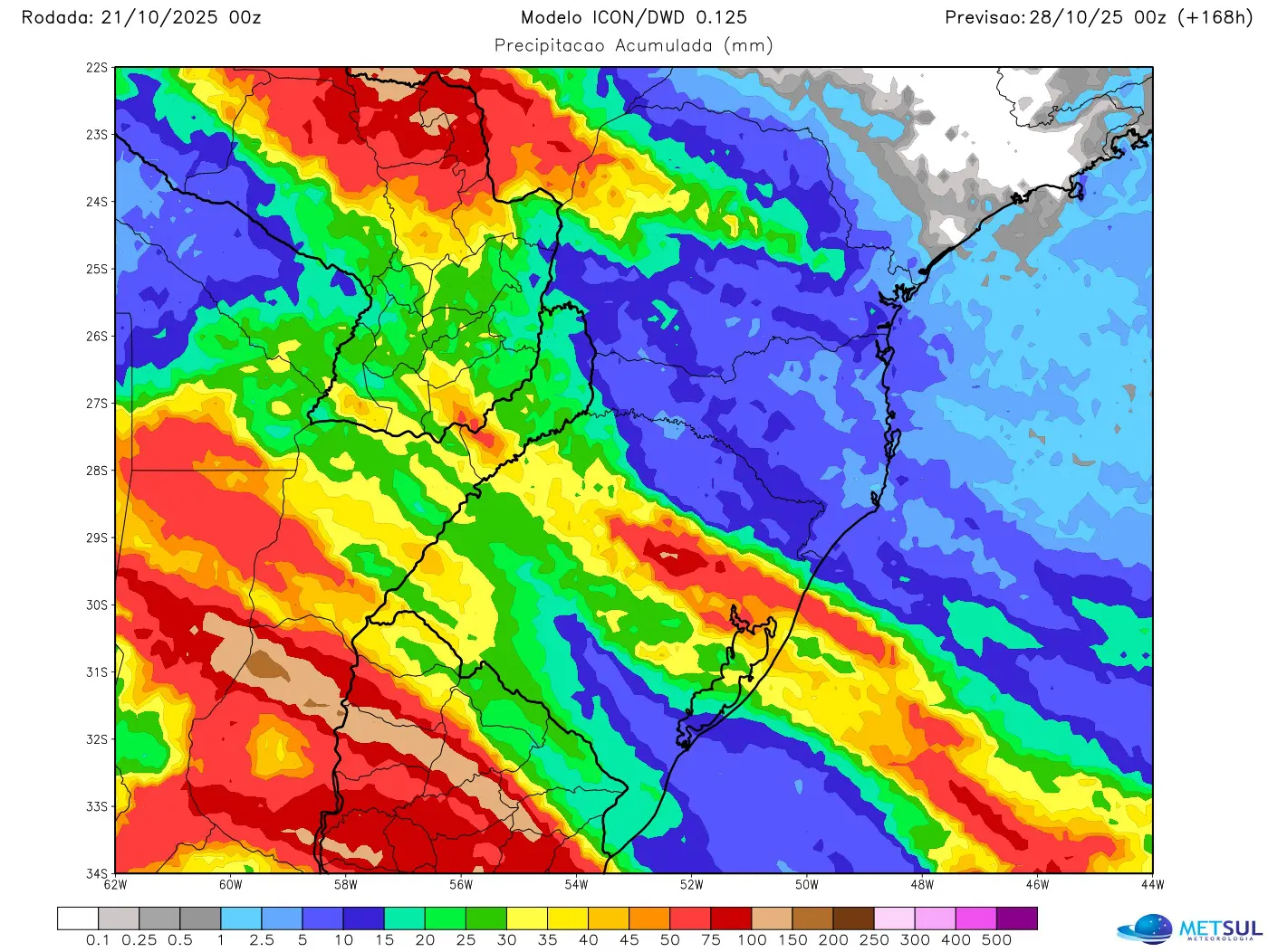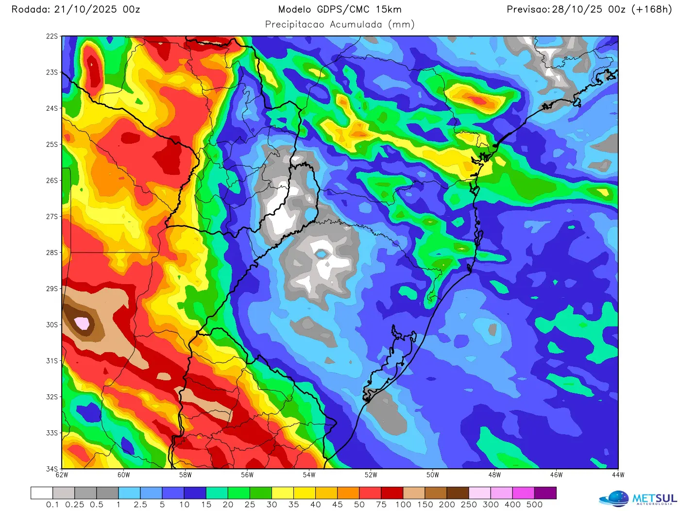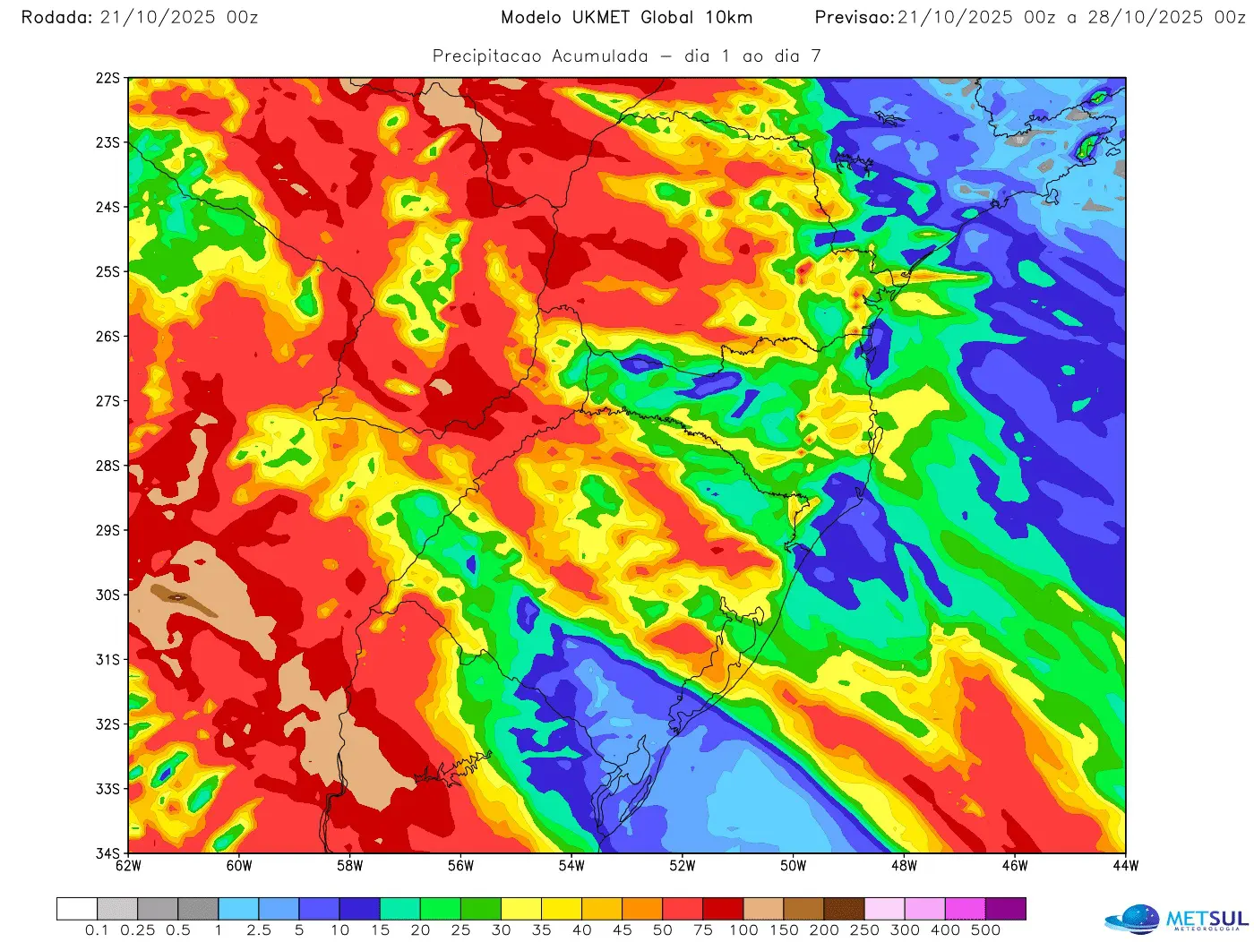 Os dados analisados pela MetSul Meteorologia a partir dos principais modelos mundiais de previsão do tempo apontam que os volumes de chuva associados ao avanço desta nova frente fria devem variar muito de uma área para a outra.