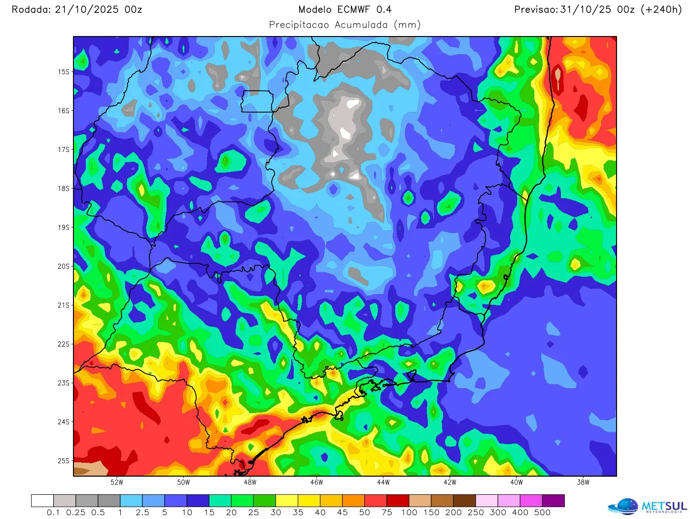 Já o mapa a seguir traz a projeção de chuva para dez dias do modelo matemático do Centro Meteorológico Europeu (ECMWF) para o Sudeste do Brasil em que se constata como a chuva não deve ter altos volumes na maior parte da região com os acumulados mais altos em pontos de São Paulo.