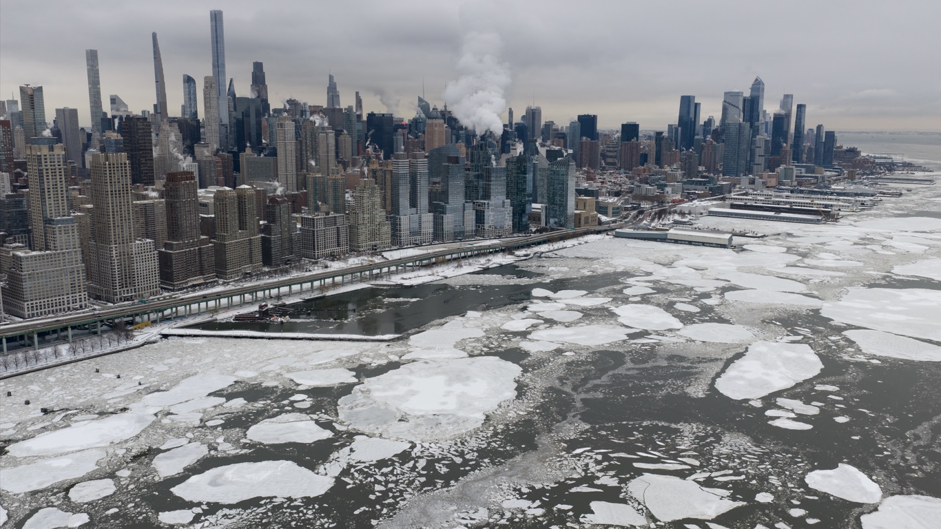 O Hudson é um braço de mar sujeito a marés, o que faz com que o gelo se apresente como enormes “panquecas” e blocos irregulares que colidem silenciosamente sob as balsas da cidade.