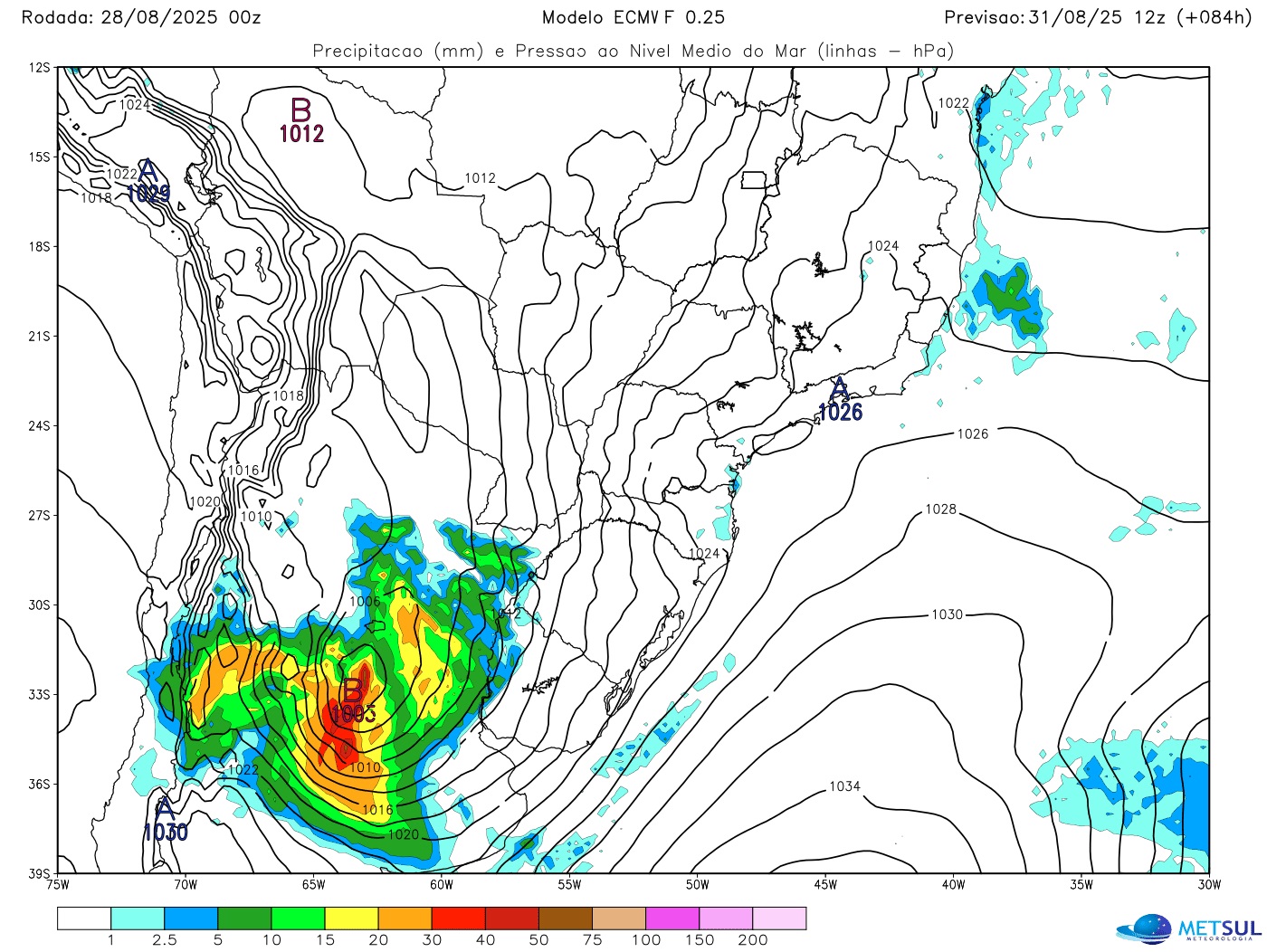 O mês de agosto vai terminar com uma nova ciclogênese na Argentina. A formação do ciclone novamente se dará sobre o continente e afetará com maior intensidade o país vizinho com chuva volumosa e vento forte a intenso.
