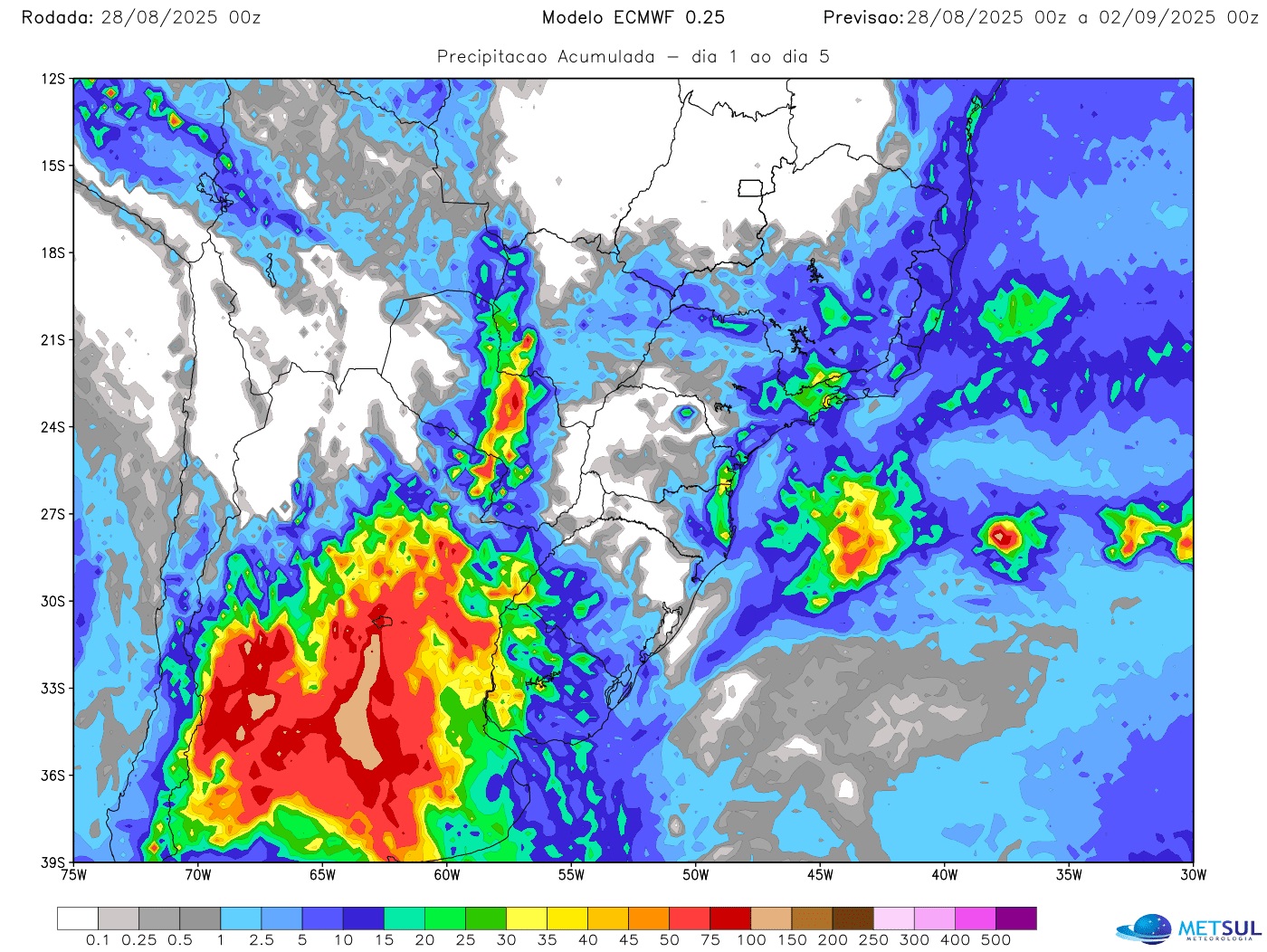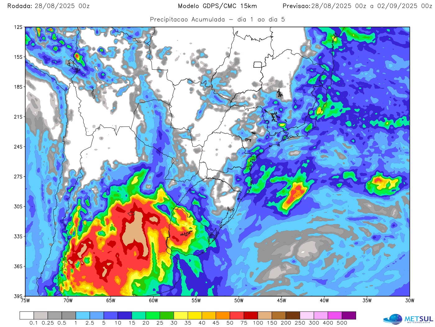 Os acumulados podem ser localmente significativos em pontos do Centro da Argentina, com marcas em alguns locais ao redor e acima de 100 mm. Como áreas da província de Buenos Aires estão alagadas pelas recentes chuvas volumosas, a situação deve piorar na região com impacto para o plantio da safra de verão.