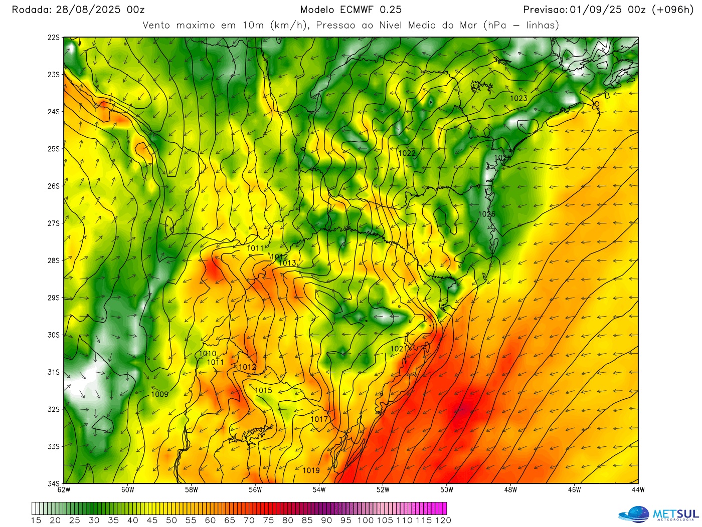 O contraste de pressão atmosférica entre um potente centro de alta pressão no Atlântico e o ciclone (baixa pressão) que se forma no continente na Argentina vai trazer vento forte de Leste a Nordeste no Rio Grande do Sul no começo da semana.