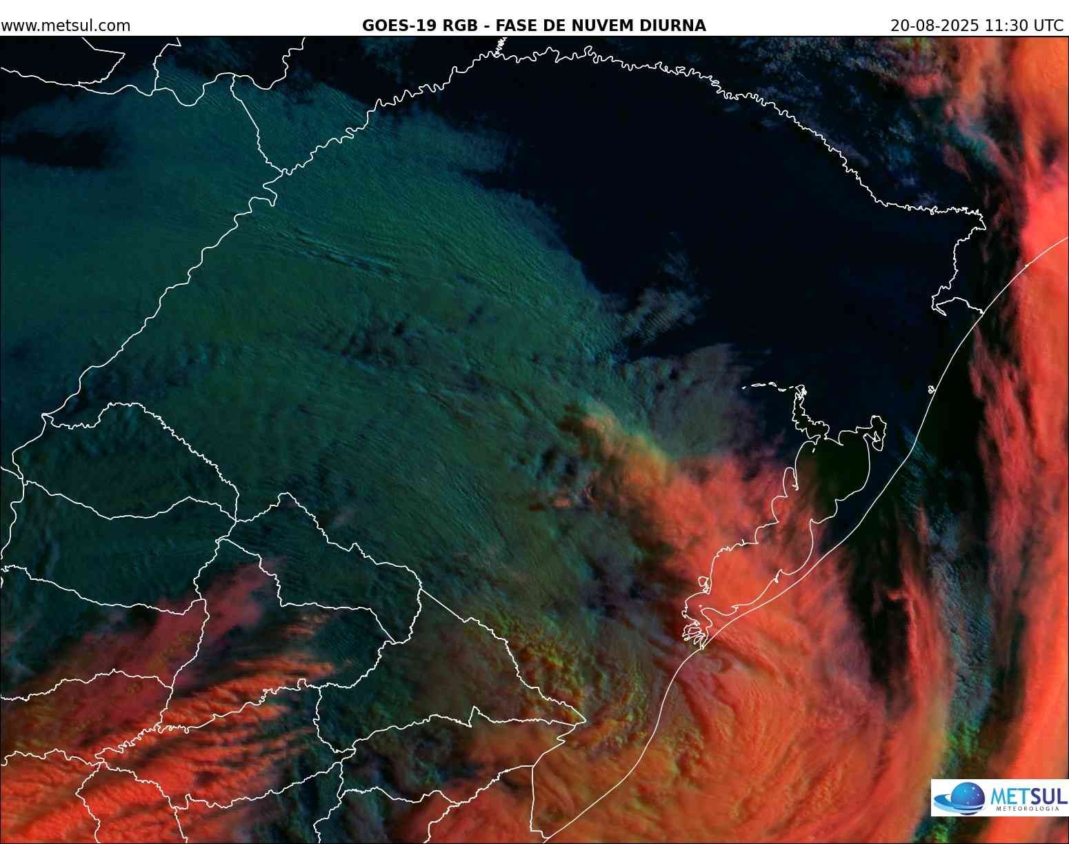 Imagem do satélite GOES-19 das 8h30 desta quarta mostra nebulosidade acompanhada de vento da circulação ciclônica se aproximando de Porto Alegre | METSUL