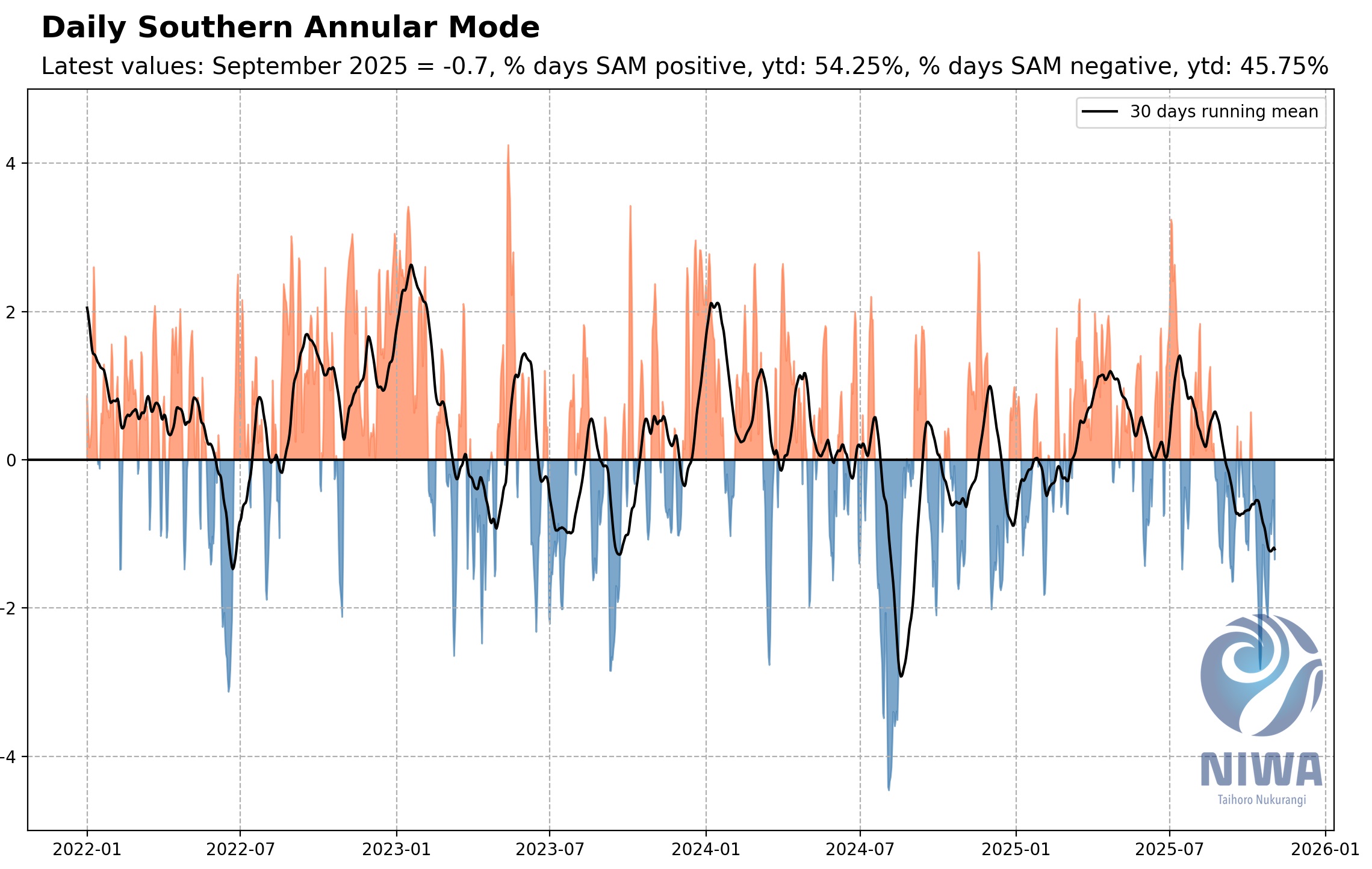 A chamada Oscilação Antártica (AAO) ou Modelo Anular Sul ou Meridional é uma das mais importantes variáveis que impacta as condições no Brasil e no Hemisfério Sul, tanto na chuva como na temperatura. Do que se trata? Trata-se de um índice de variabilidade relacionado ao cinturão de vento e de baixas pressões ao redor da Antártida. Há quase três meses ela vem em terreno predominantemente negativo.