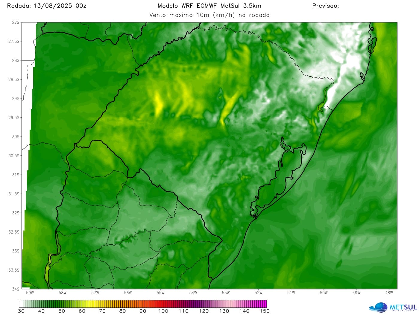 O mapa acima mostra a projeção de vento máximo indicada pelo modelo de alta resolução WRF em que se observa que não deve ser esperado vento muito forte, embora possam ocorrer algumas rajadas de vento Sul na troca de massas de ar.